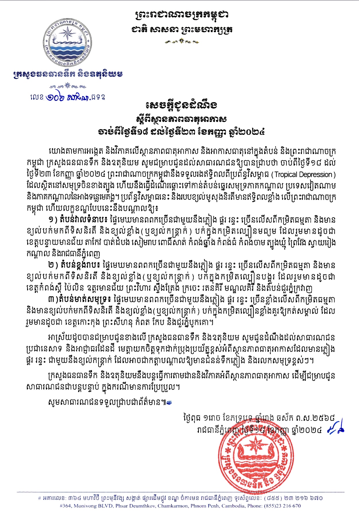 រាជធានីភ្នំពេញ៖ យោងតាមការចុះផ្សាយរបស់ ក្រសួងធនធានទឹក និងឧតុនិយម បានចេញសេចក្ដីជូនដំណឹង ដល់សាធារណជនឱ្យបានជ្រាបថា យោងតាមការអង្កេត និងវិភាគលើស្ថានភាពធាតុអាកាស និងអាកាសធាតុនៅក្នុងតំបន់ និងព្រះរាជាណាចក្រកម្ពុជា ក្រសួងធនធានទឹក បានឱ្យដឹងថា ចាប់ពីថ្ងៃទី១៨ ដល់ ថ្ងៃទី២៣ ខែកញ្ញា ឆ្នាំ២០២៤ ព្រះរាជាណាចក្រកម្ពុជា នឹងទទួលរងឥទ្ធិពលពីប្រព័ន្ធវិសម្ពាធ (Tropical Depression) ដែលស្ថិតនៅសមុទ្រចិនខាងត្បូង ហើយនឹងធ្វើដំណើរឆ្ពោះទៅកាន់តំបន់ឆ្នេរសមុទ្រភាគកណ្តាល ប្រទេសវៀតណាម និងភាគកណ្តាលនៃអាងទន្លេមេគង្គ។ ប្រព័ន្ធវិសម្ពាធនេះ និងរបបខ្យល់មូសុងនិរតីមានឥទ្ធិពលខ្លាំង លើព្រះរាជាណាចក្រ កម្ពុជា ហើយលក្ខខណ្ឌបែបនេះនឹងបណ្តាលឱ្យ៖