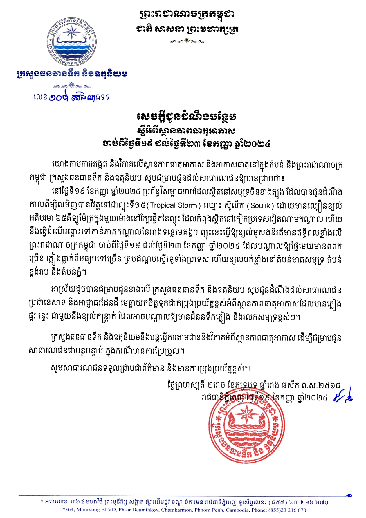 ក្រសួងធនធានទឹក បានឱ្យដឹងថា នៅថ្ងៃទី១៩ ខែកញ្ញា ឆ្នាំ២០២៤ ប្រព័ន្ធវិសម្ពាធទាបដែលស្ថិតនៅសមុទ្រចិនខាងត្បូងដែលបានជូនដំណឹងកាលពីម្សិលមិញបានវិវត្តទៅជាព្យុះទី១៥ (Tropical Storm) ឈ្មោះ ស៊ូលីក (Soulik) ដោយមានល្បឿនខ្យល់អតិបរមា ៦៥គីឡូម៉ែត្រក្នុងមួយម៉ោង នៅក្បែរផ្ចិតនៃព្យុះ ដែលកំពុងស្ថិតនៅកៀកប្រទេសវៀតណាមកណ្តាល ហើយនឹងធ្វើដំណើរឆ្ពោះទៅកាន់ភាគកណ្តាលនៃអាងទន្លេមេគង្គ។ ព្យុះនេះធ្វើឱ្យខ្យល់មូសុងនិរតីមានឥទ្ធិពលខ្លាំងលើព្រះរាជាណាចក្រកម្ពុជា ចាប់ពីថ្ងៃទី១៩ ដល់ថ្ងៃទី២៣ ខែកញ្ញា ឆ្នាំ២០២៤ ដែលបណ្តាលឱ្យផ្ទៃមេឃមានពពកច្រើន ភ្លៀងធ្លាក់ពីមធ្យមទៅច្រើន គ្របដណ្តប់ស្ទើរទូទាំងប្រទេស ហើយខ្យល់បក់ខ្លាំងនៅតំបន់មាត់សមុទ្រ តំបន់ខ្ពង់រាប និងតំបន់ភ្នំ។