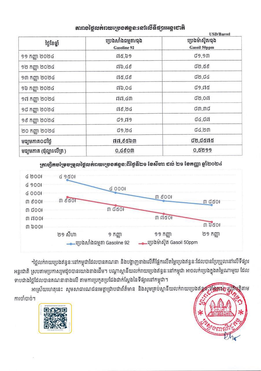 រាជធានីភ្នំពេញ៖ នៅថ្ងៃទី២១ ខែកញ្ញា ឆ្នាំ២០២៤ យោងតាមការចុះផ្សាយរបស់ ក្រសួងពាណិជ្ជកម្ម បានចេញសេចក្តីជូនដំណឹង ប្រកាសពីតម្លៃលក់រាយប្រេងឥន្ធនៈ នៅតាមស្ថានីយនានាដោយចាប់ពីថ្ងៃទី២១ ដល់ថ្ងៃទី៣០ ខែកញ្ញា ឆ្នាំ២០២៤ ត្រូវលក់សាំងធម្មតាតម្លៃ ៣,៨៥០រៀល និងម៉ាស៊ូតត្រូវលក់ ៣,៦៥០រៀល ក្នុង១លីត្រ។