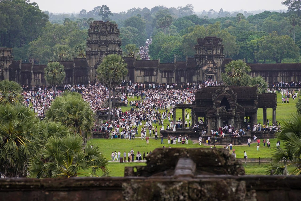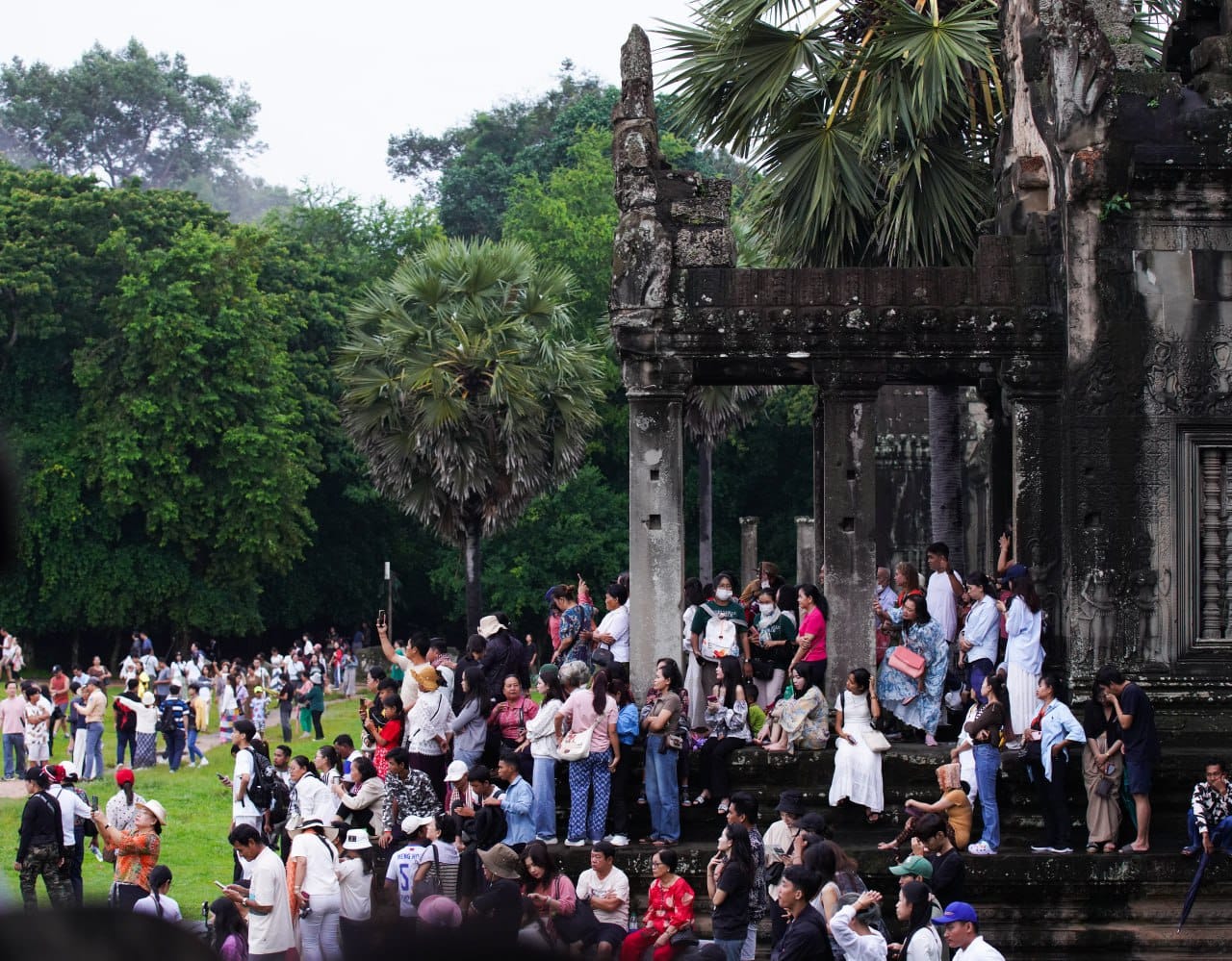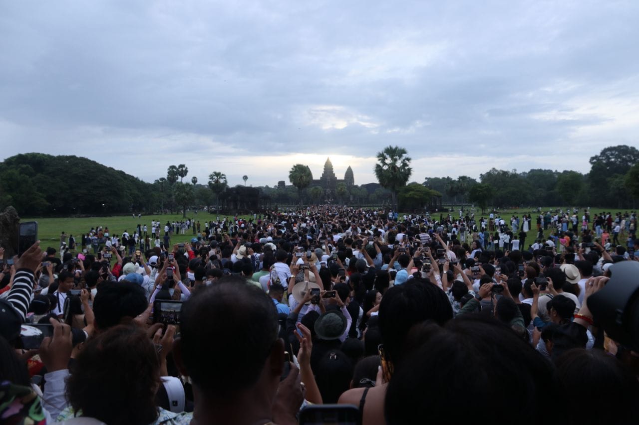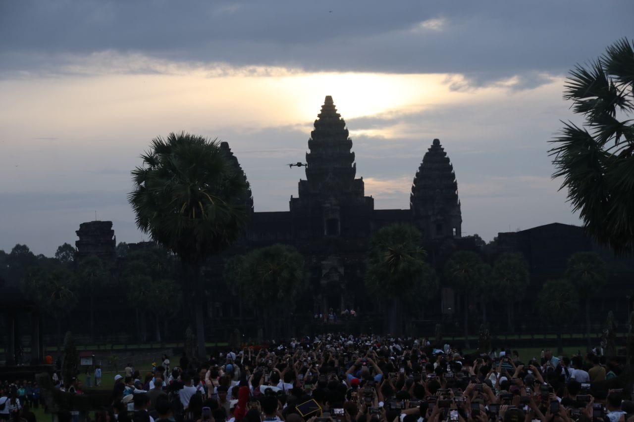 ភ្ញៀវទេសចរយ៉ាងច្រើនកុះករ ស្កាត់មកពីទីជិតឆ្ងាយ ដើម្បីរង់ចាំទស្សនាថ្ងៃរះចំកំពូលកណ្តាលប្រាសាទអង្គរវត្ត