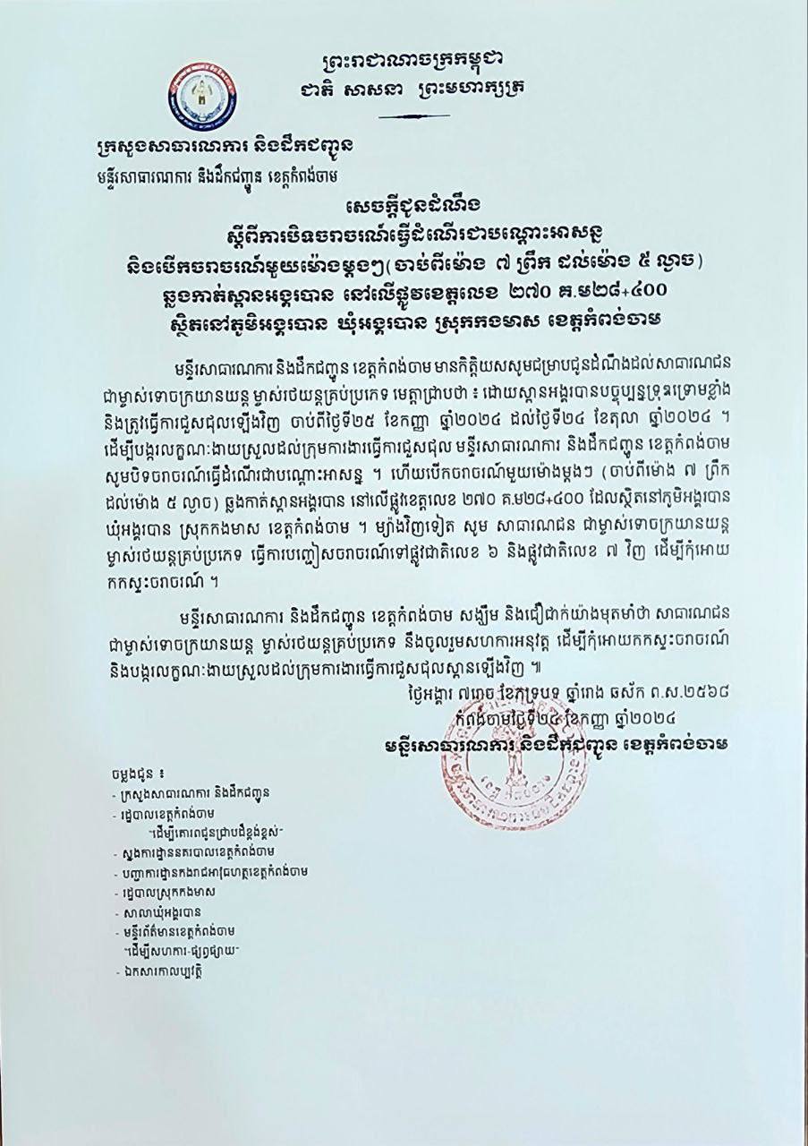 ខេត្តកំពង់ចាម៖ នៅថ្ងៃទី២៥ ខែកញ្ញា ឆ្នាំ២០២៤ យោងតាមការចុះផ្សាយរបស់ មន្ទីរសាធារណការ និងដឹកជញ្ជូន ខេត្តកំពង់ចាម បានចេញសេចក្ដីជូនដំណឹង ស្តីពីការបិទចរាចរណ៍ធ្វើដំណើរជាបណ្តោះអាសន្ន និងបើកចរាចរណ៍មួយម៉ោងម្តងៗ ចាប់ពីម៉ោង ៧ព្រឹក ដល់ម៉ោង ៥ល្ងាច ឆ្លងកាត់ស្ពានអង្គរបាន នៅលើផ្លូវខេត្តលេខ ២៧០ គ.ម២៨+៤០០ ស្ថិតនៅភូមិអង្គរបាន ឃុំអង្គរបាន ស្រុកកងមាស ខេត្តកំពង់ចាម។