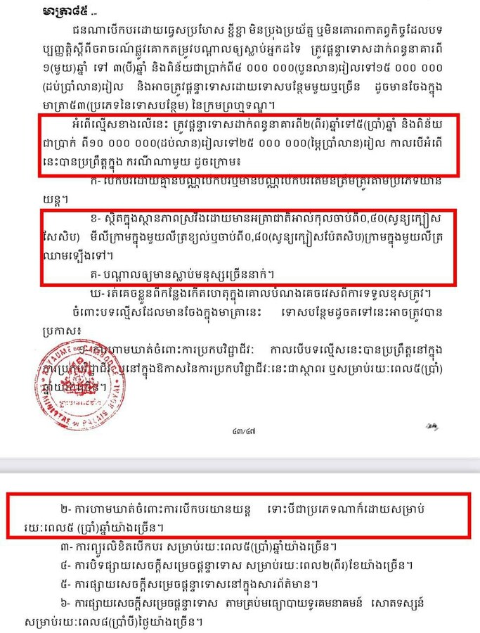គួរបញ្ជាក់ផងដែរថា ចៅក្រមជំនុំជម្រះនៃសាលាដំបូងរាជធានីភ្នំពេញ សម្រេចផ្ដន្ទាទោសជនជាប់ចោទឈ្មោះ នាង សំអឿន ភេទប្រុស អាយុ ៥៦ឆ្នាំ ដាក់ពន្ធនាគារកំណត់រយៈពេល ០៥ (ប្រាំ) ឆ្នាំ និងពិន័យជាប្រាក់ចំនួន ២០ ០០០ ០០០ (ម្ភៃលាន) រៀល ពីបទបើកបរស្ថិតក្នុងស្ថានភាពស្រវឹងបង្កគ្រោះថ្នាក់បណ្តាលឱ្យស្លាប់ និងរបួសអ្នកដទៃ ដែលប្រព្រឹត្តនៅចំណុច ស្ពានឫស្សីកែវ ប្រសព្វផ្លូវជាតិលេខ៥ និងស្ពានប្ញស្សីកែវថ្មី ភូមិមិត្តភាព សង្កាត់ប្ញស្សីកែវ ខណ្ឌឫស្សីកែវ រាជធានី ភ្នំពេញ កាលពីថ្ងៃទី២០ ខែមករា ឆ្នាំ២០២៤។ បទល្មើសព្រហ្មទណ្ឌនេះ មានចែង និងផ្តន្ទាទោសតាមមាត ៨៣ កថាខណ្ឌទី២ ចំណុច ខ ចំណុច គ និងមាត្រា ៨៥ កថាខណ្ឌទី២ ចំណុច ខ ចំណុច គ នៃច្បាប់ស្តីពីចរាចរណ៍ផ្លូវគោក។ នេះបើយោងតាមសេចក្តីប្រកាសព័ត៍មានសាលាដំបូងរាជធានីភ្នំពេញ ចុះថ្ងៃទី២៥ ខែកញ្ញានេះ។