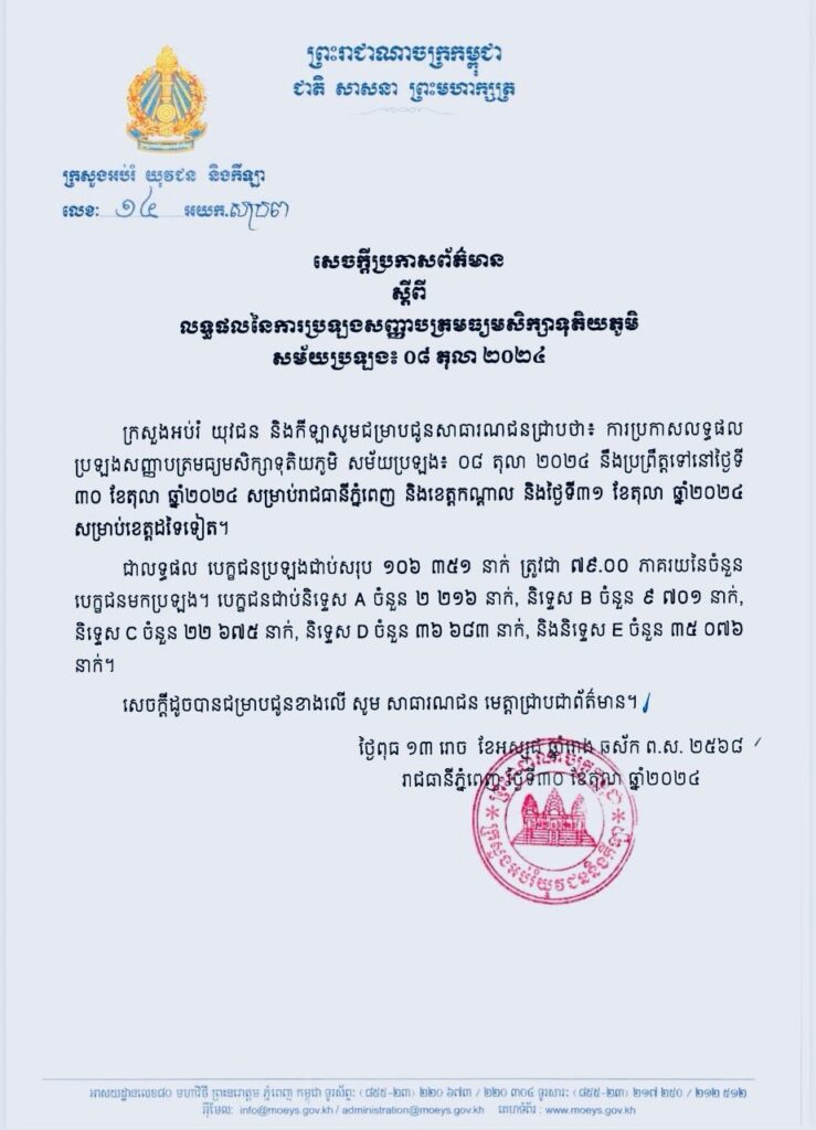 ក្រសួងអប់រំ ប្រកាស លទ្ធផលប្រឡងសញ្ញាបត្របាក់ឌុប២០២៤ បេក្ខជនជាប់និទ្ទេស A ចំនួន ២ ២១៦នាក់