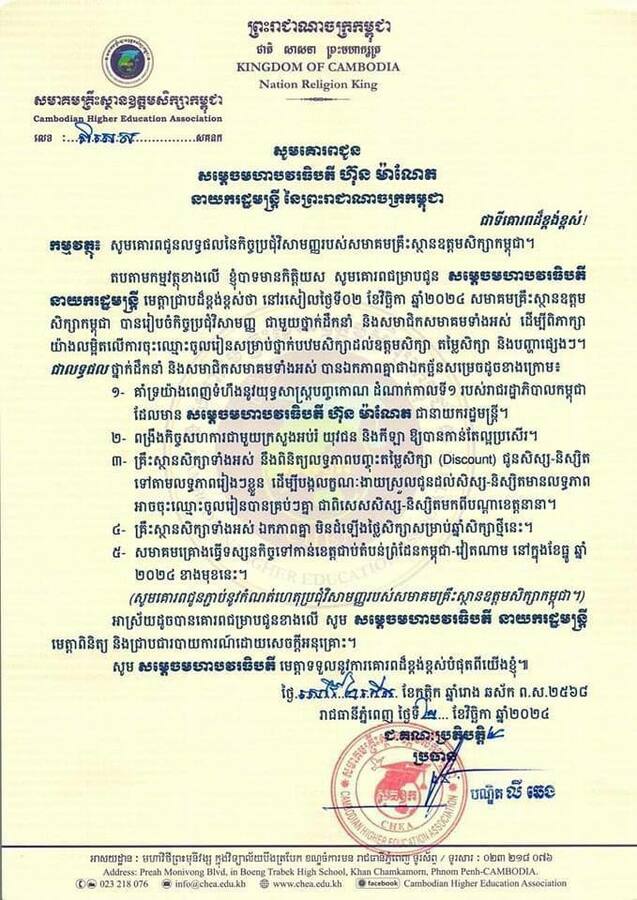 សម្តេចមហាបវរធិបតី បានបន្ថែមថា ជាលទ្ធផលសមាគមគ្រឹះស្ថានឧត្ដមសិក្សាកម្ពុជា បានឯកភាពមិនដំឡើងថ្លៃសិក្សាសម្រាប់ឆ្នាំសិក្សាថ្មី២០២៤-២០២៥នេះ ហើយគ្រឹះស្ថានសិក្សាទាំងអស់នឹងពិនិត្យលទ្ធភាពបញ្ចុះតម្លៃសិក្សាជូនសិស្ស-និស្សិត ទៅតាមលទ្ធភាពរៀងៗខ្លួនផងដែរ។ ដោយឡែកចំពោះសហព័ន្ធសេវាអប់រំនៃកម្ពុជា ក៏បានឯកភាពមិនដំឡើងថ្លៃសិក្សាសម្រាប់ឆ្នាំសិក្សា ២០២៥-២០២៦ជំនួសវិញ ព្រោះឆ្នាំសិក្សា ២០២៤-២០២៥ គ្រឹះស្ថានសិក្សាជាច្រើនដែលជាសមាជិកសហព័ន្ធបានបើកបវេសនកាលតាំងពីខែកក្កដា ឬសីហា រួចទៅហើយ។ ក្នុងនាមរាជរដ្ឋាភិបាល សម្តេចប្រមុខរាជរដ្ឋាភិបាល បានកោតសរសើរចំពោះស្មារតីសហការ និងសូមថ្លែងអំណរគុណចំពោះសមាគមគ្រឹះស្ថានឧត្តមសិក្សាកម្ពុជា និងសហព័ន្ធសេវាអប់រំនៃកម្ពុជា ដែលបានយល់ស្របតាមសំណើរបស់សម្តេច ដោយមិនដំឡើងថ្លៃសិក្សាសម្រាប់ឆ្នាំសិក្សាថ្មី ក៏ដូចជាការពិនិត្យលទ្ធភាពបញ្ចុះថ្លៃសិក្សាជូនសិស្ស-និស្សិត ទៅតាមលទ្ធភាពរៀងៗខ្លួនរបស់គ្រឹះស្ថានអប់រំនីមួយៗ។