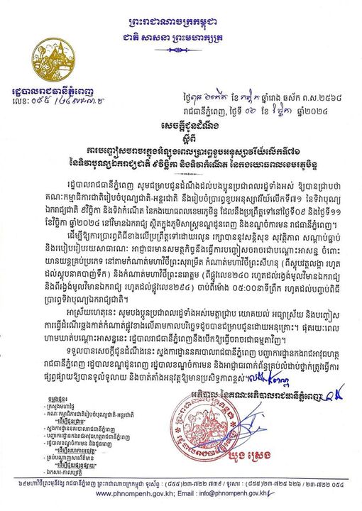 (រាជធានីភ្នំពេញ)៖ កាលពីថ្ងៃទី ៦ ខែវិច្ឆិកា ឆ្នាំ ២០២៤ កន្លងទៅ រដ្ឋបាលរាជធានីភ្នំពេញ ចេញសេចក្តីជូនដំណឹង ស្តីពីការបញ្ចៀសចរាចរក្នុងអំឡុងពេលប្រារព្ធខួបអនុស្សាវរីយ៍លើកទី៧១ នៃទិវាបុណ្យឯករាជ្យជាតិ ៩ វិច្ឆិកា និងទិវាកំណើត នៃកងយោធពលខេមរភូមិន្ទ ដែលនឹងប្រព្រឹត្តទៅនៅថ្ងៃទី ០៩ និងថ្ងៃទី ១១ ខែវិច្ឆិកា ឆ្នាំ ២០២៤ នៅវិមានឯករាជ្យ ស្ថិតក្នុងភូមិសាស្ត្រខណ្ឌដូនពេញ និងខណ្ឌចំការមន រាជធានីភ្នំពេញ។