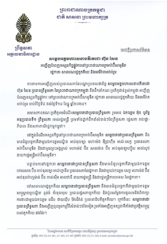 (ភ្នំពេញ)៖ នៅព្រឹកថ្ងៃទី៨ ខែធ្នូ ឆ្នាំ២០២៤នេះ សម្តេចអគ្គមហាសេនាបតីតេជោ ហ៊ុន សែន ប្រធានព្រឹទ្ធសភានៃព្រះរាជាណាចក្រកម្ពុជា ដឹកនាំគណៈប្រតិភូជាន់ខ្ពស់កម្ពុជា អញ្ជើញបំពេញទស្សនកិច្ចផ្លូវការ នៅព្រះរាជាណាចក្រអារ៉ាប៊ីសាអូឌីត រដ្ឋកាតា សាធារណរដ្ឋតួកគីយេ និងអេមីរ៉ាតអារ៉ាប់រួម សរុបរយៈពេល១សប្តាហ៍ ចាប់ពីថ្ងៃទី៨ ដល់ថ្ងៃទី១៤ ខែធ្នូ ឆ្នាំ២០២៤។