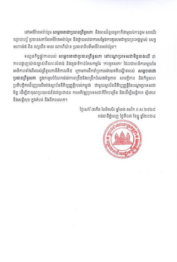 នៅអេមីរ៉ាតអារ៉ាប់រួម សម្តេចតេជោប្រធានព្រឹទ្ធសភា នឹងមានជំនួបទ្វេភាគីជាមួយលោក សាឃើរ ហ្គោបាហ្ស ប្រធានសភានៃអេមីរ៉ាតអារ៉ាប់រួម និងថ្វាយសវនាការសម្តែងការគួរសមជាមួយព្រះអង្គម្ចាស់ សេក្ខ មហាម៉េដ ពិន ហ្សេយឺត អាល ណាហ៊ីយ៉ាន ប្រធានាធិបតីអេមីរ៉ាតអារ៉ាប់រួម។