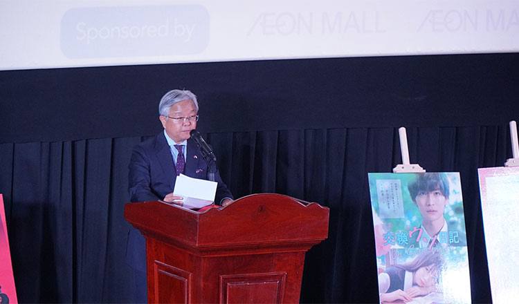 ឯកឧត្តម អ៊ូអិណុ អាត់ស៊ូស៊ី ឯកអគ្គរាជទូតជប៉ុនប្រចាំកម្ពុជា បានថ្លែងថា មហោស្រពភាពយន្តជប៉ុនដែលបានចាប់ផ្តើមដំបូងក្នុងឆ្នាំ២០១៥ ឆ្នាំនេះត្រូវបានប្រារព្ធឡើងរួច ហើយនៅខេត្តបាត់ដំបង កំពត និងសៀមរាប ហើយឥឡូវនេះកំពុងចាប់ផ្តើមនៅទីនេះ នៅរាជធានីភ្នំពេញ។ ក្រៅពីរីករាយនឹងការទស្សនាភាពយន្ត យើងសង្ឃឹមថា ប្រជាជនកម្ពុជានឹងបានឃើញនូវទិដ្ឋភាពចម្រុះនៃសង្គម និងវប្បធម៌របស់ប្រទេសជប៉ុន តាមរយៈការទស្សនាភាពយន្តជាច្រើនប្រភេទ ហើយកាន់តែចាប់អារម្មណ៍លើប្រទេសជប៉ុន។ យើងក៏សង្ឃឹមផងដែរថា លោកអ្នកដែលមិនធ្លាប់ឃើញទិដ្ឋភាពនានារបស់ប្រទេសជប៉ុន នឹងរកឃើញភាពទាក់ទាញនៃប្រទេសមួយនេះតាមរយៈមហោស្រពភាពយន្តជប៉ុន។