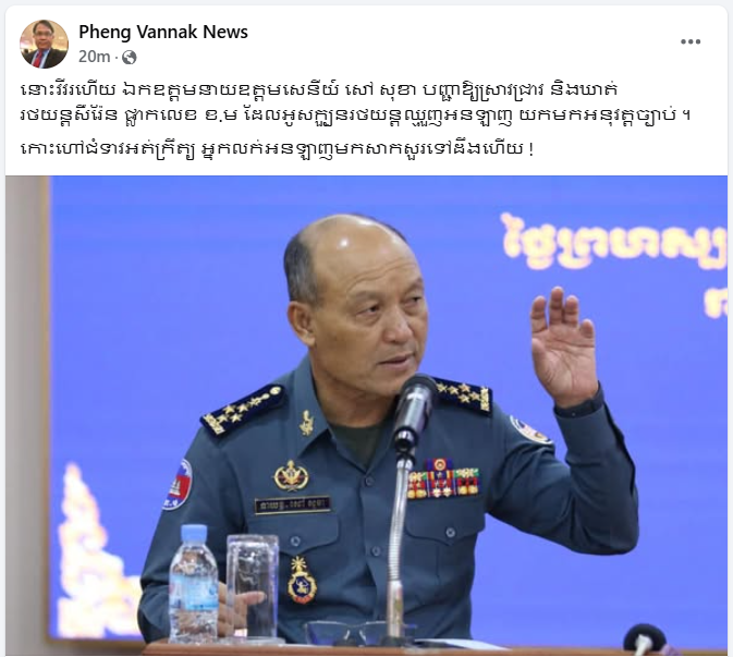 យោងតាមការបង្ហោះនៅលើផេក Pheng Vannak News បានឱ្យដឹងដូច្នេះថា៖ « នោះវីវរហើយ ឯកឧត្តមនាយឧត្តមសេនីយ៍ សៅ សុខា បញ្ជាឱ្យស្រាវជ្រាវ និងឃាត់រថយន្តសឺរ៉ែន ផ្លាកលេខ ខ.ម ដែលអូសក្បួនរថយន្តឈ្មួញអនឡាញ យកមកអនុវត្តច្បាប់ »៕