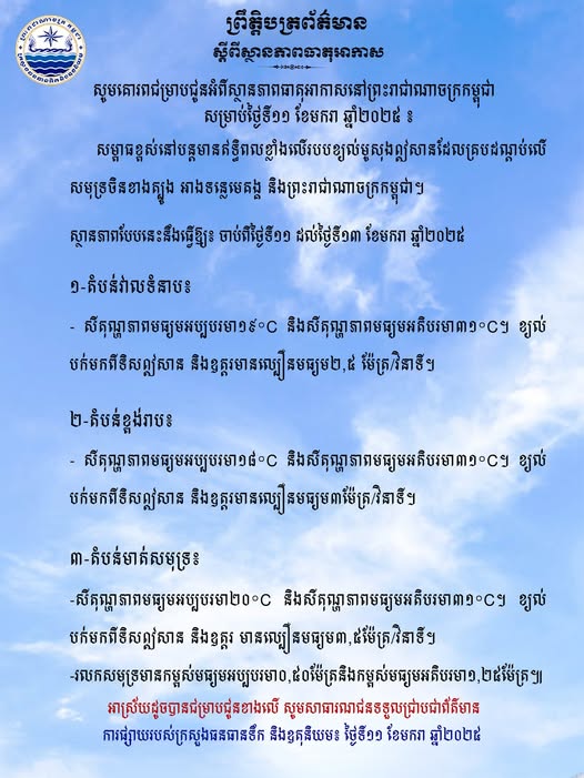 ក្រសួងធនធានទឹក និងឧតុនិយមជូនអំពីស្ថានភាពធាតុអាកាសនៅព្រះរាជាណាចក្រកម្ពុជាសម្រាប់ថ្ងៃទី១១ ខែមករា ឆ្នាំ២០២៥៖