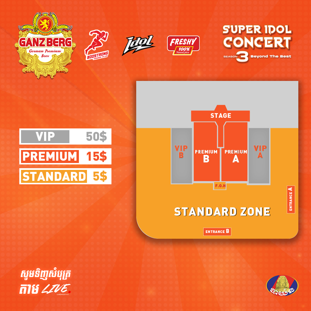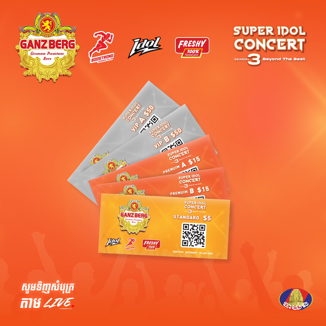 ឧបត្ថម្ភគាំទ្រជាពិសេសផ្ដាច់មុខដោយ Ganzberg ផឹកស្រួល ស្រួលផឹក ផឹក Ganzberg និងសហការឧបត្ថម្ភដោយ ភេសជ្ជៈ Boostrong ភេសជ្ជៈ iDOL និង ទឹកផ្លែឈើ Freshy។