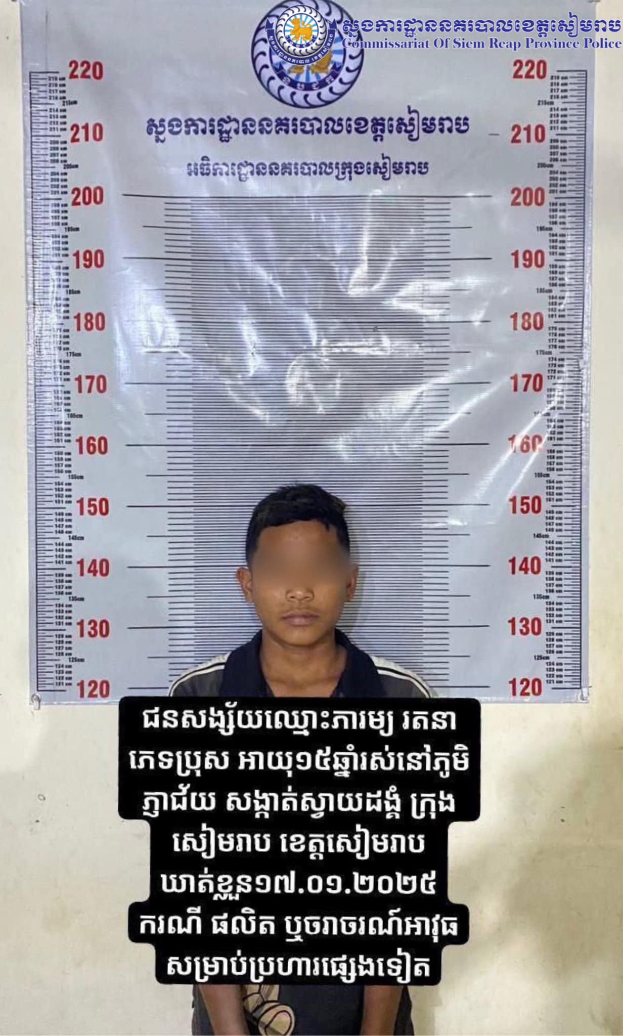 (សៀមរាប)៖ ថ្ងៃទី១៨ ខែមករា ឆ្នាំ២០២៥ យោងតាមការចុះផ្សាយរបស់ ស្នងការដ្ឋាននគរបាលខេត្តសៀមរាប បានឱ្យដឹងថា ដោយមានការដឹកនាំបញ្ជាផ្ទាល់ពី លោកឧត្តមសេនីយ៍ទោ ហួត សុធី ស្នងការនគរបាលខេត្ត កម្លាំងនគរបាលព្រហ្មទណ្ឌកម្រិតធ្ងន់ សហការជាមួយកម្លាំង នៃអធិការដ្ឋាននគរបាលក្រុងសៀមរាប បានស្រាវជ្រាវ ពាក់ព័ន្ធនឹងបទល្មើសជាក់ស្ដែងករណី(ក្មេងទំនើង) ផលិត ឬចរាចរណ៍អាវុធសម្រាប់ប្រហារផ្សេងទៀត (កាន់កាំបិតគំរាមគូរជម្លោះ និងថតបង្ហោះក្នុងបណ្ដាញសង្គម) បានធ្វើការនាំខ្លួនជនសង្ស័យចំនួន ៣នាក់។