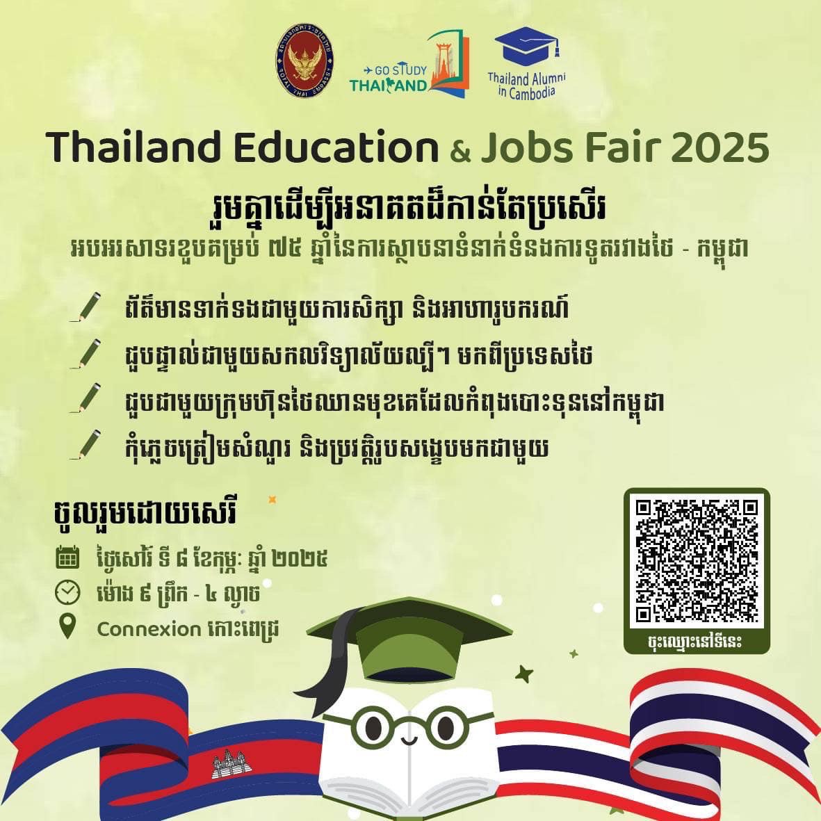 ស្ថានទូតថៃប្រចាំកម្ពុជារួមសហការជាមួយបណ្ដាញអតីតនិស្សិតដែលបញ្ចប់ការសិក្សាពីប្រទេសថៃ និង Go Study Thailand មានក្ដីសោមន្សសូមអញ្ជើញសិស្សនិស្សិត អ្នកដែលបញ្ចប់ការសិក្សា និងអ្នកដែលកំពុងស្វែងរកការងារនៅកម្ពុជាចូលរួមកម្មវិធីពិព័រណ៍ការសិក្សា និងការងារឆ្នាំ២០២៥ “Thailand Education and Jobs Fair 2025” ឲ្យបានច្រើនកុះករ។