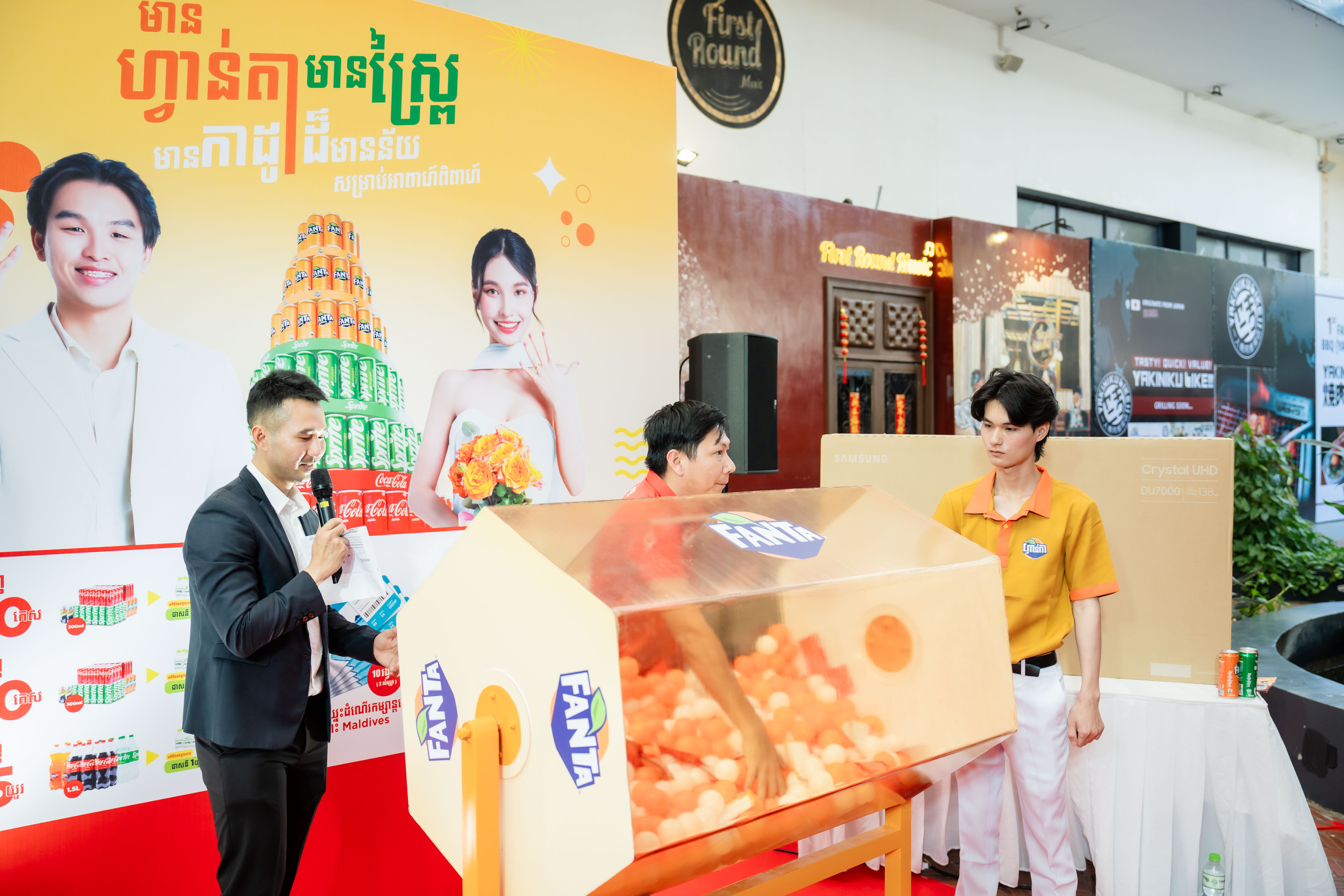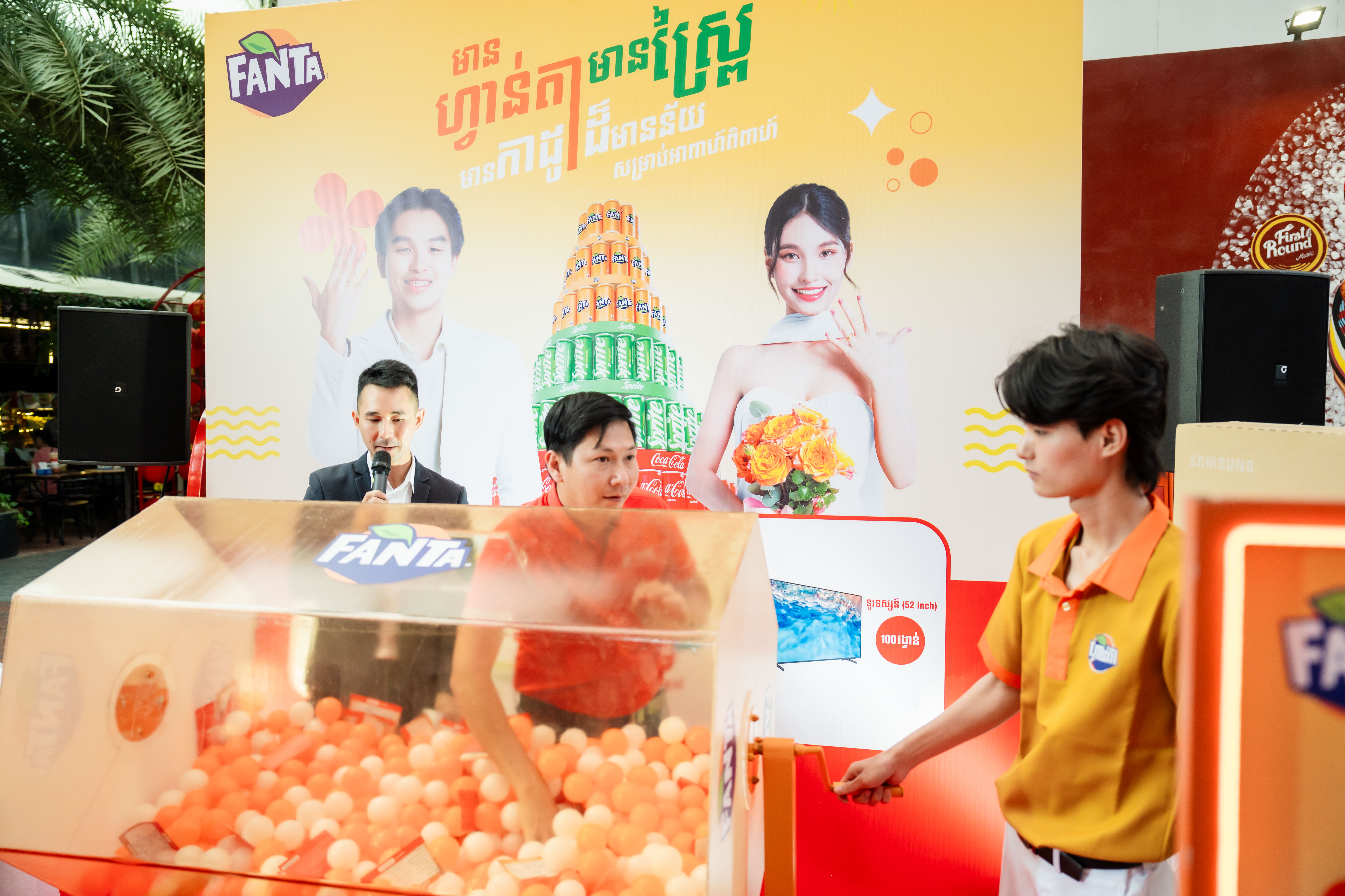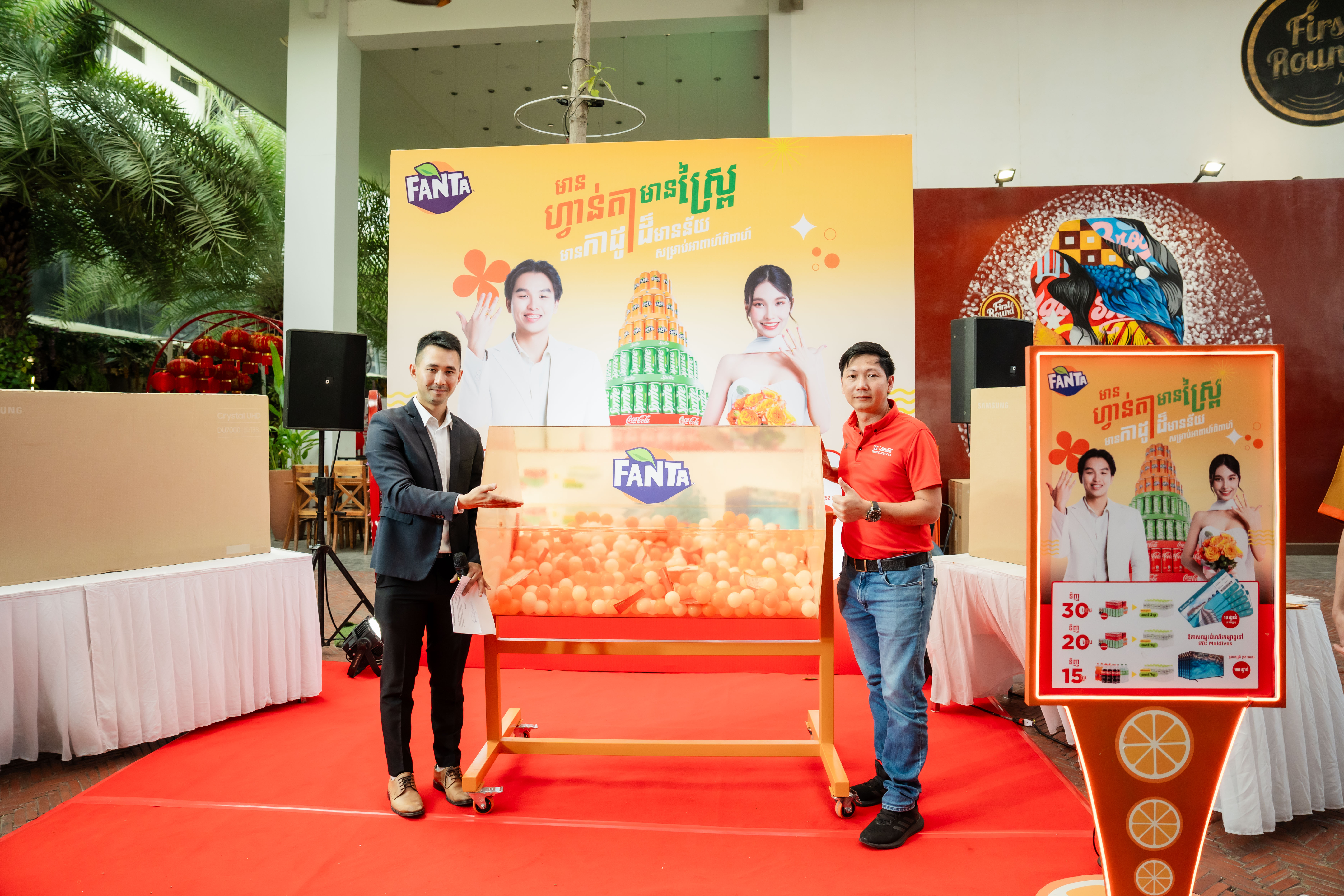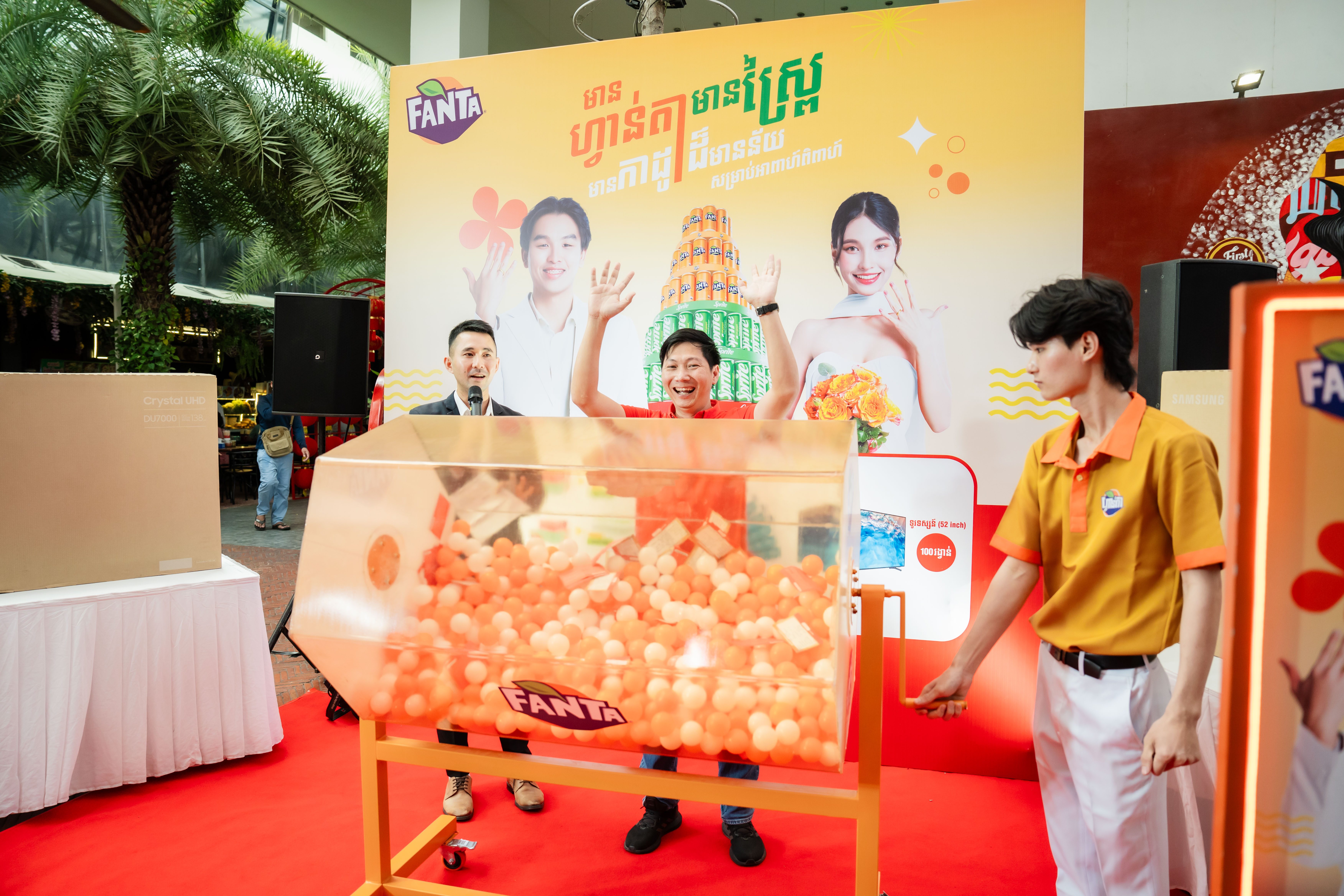 ការប្រកាសអ្នកឈ្នះរង្វាន់ដ៏គួរឱ្យរំភើបរីករាយនេះ បានធ្វើឡើងនៅផ្សារ Eden Garden Mall រាជធានីភ្នំពេញ។ បន្ថែមពីនេះ យើងខ្ញុំសូមអបអរសាទរដល់គូស្វាមីភរិយាចំនួន ២០គូទៀត ដែលបានឈ្នះរង្វាន់ ទូរទស្សន៍ទំហំ ៥២ អ៉ីញ ចំនួន ២០គ្រឿង សម្រាប់ប្រើប្រាស់នៅក្នុងគេហដ្ឋានរបស់គូស្វាមីភរិយាថ្មី! ការផ្តល់ជូនរង្វាន់របស់ ហ្វាន់តា និងស្ព្រៃដល់គូស្វាមីភរិយាក្នុងពិធីអាពាហ៍ពិពាហ៍ គឺជាសក្ខីភាពមួយបញ្ជាក់ពីការប្តេជ្ញាចិត្តរបស់យើងក្នុងនាំយកនូវភាពរីករាយឱ្យជីវិតកាន់តែស្រស់ស្រាយជូនអតិថិជន។