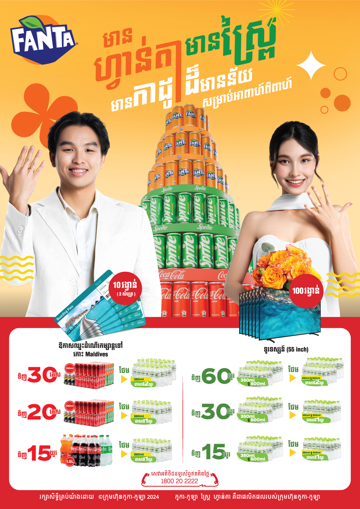លោកអ្នកអាចជាគូស្វាមីភរិយា ដែលមានឱកាសឈ្នះរង្វាន់ដ៏ពិសេសពីហ្វាន់តា និងស្ព្រៃ! សម្រាប់គូស្វាមីភរិយាថ្មីដែលមានគម្រោងរៀបអាពាហ៍ពិពាហ៍ឆាប់ៗនេះ អាចធ្វើការសាកសួរបន្ថែមដោយឥតគិតថ្លៃតាម 1800 20 2222។