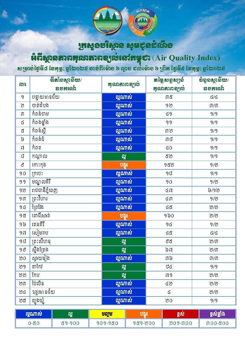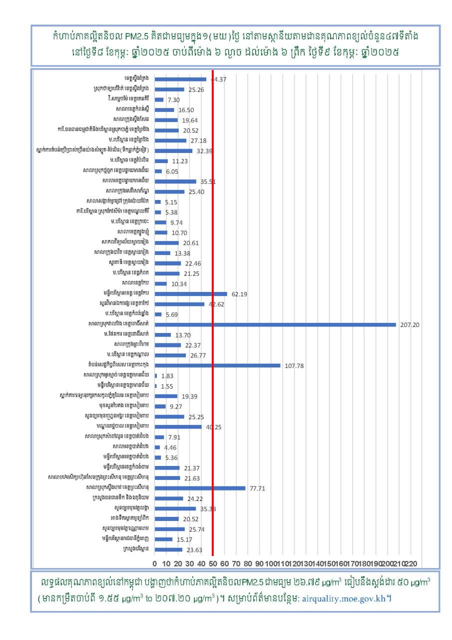 (ភ្នំពេញ)៖ យោងតាមការចុះផ្សាយរបស់ ក្រសួងបរិស្ថាន សូមជូនដំណឹងអំពីស្ថានភាពគុណភាពខ្យល់នៅក្នុងព្រះរាជាណាចក្រកម្ពុជា សម្រាប់ថ្ងៃទី៨ ខែកុម្ភៈ ឆ្នាំ២០២៥ ចាប់ពីម៉ោង ៦ ល្ងាច ដល់ម៉ោង ៦ ព្រឹក ថ្ងៃទី៩ ខែកុម្ភៈ ឆ្នាំ២០២៥ ដែលមានកំហាប់ភាគល្អិតនិចលគិតជាមធ្យមស្មើនឹង ២៦.៧៩ µg/m3 ធៀបនឹងស្តង់ដា ៥០ ug/m3 និងគិតជាសន្ទស្សន៍គុណភាពខ្យល់ (Air Quality Index)គឺ “ល្អ”។