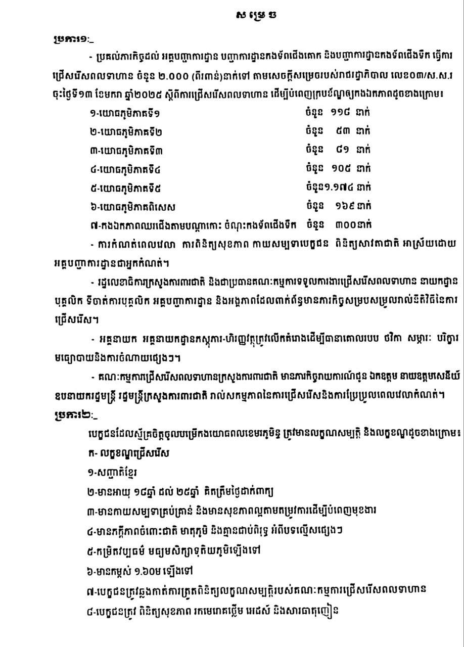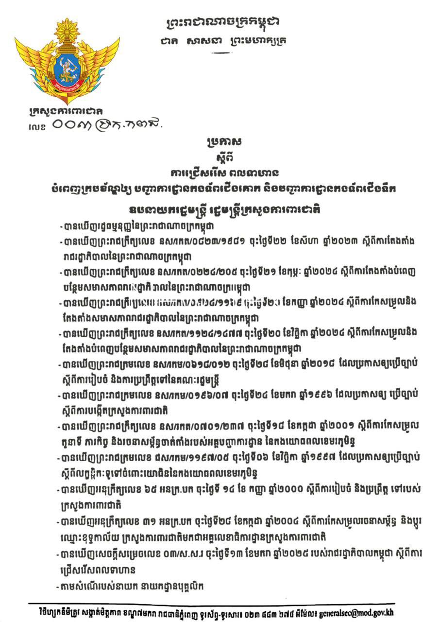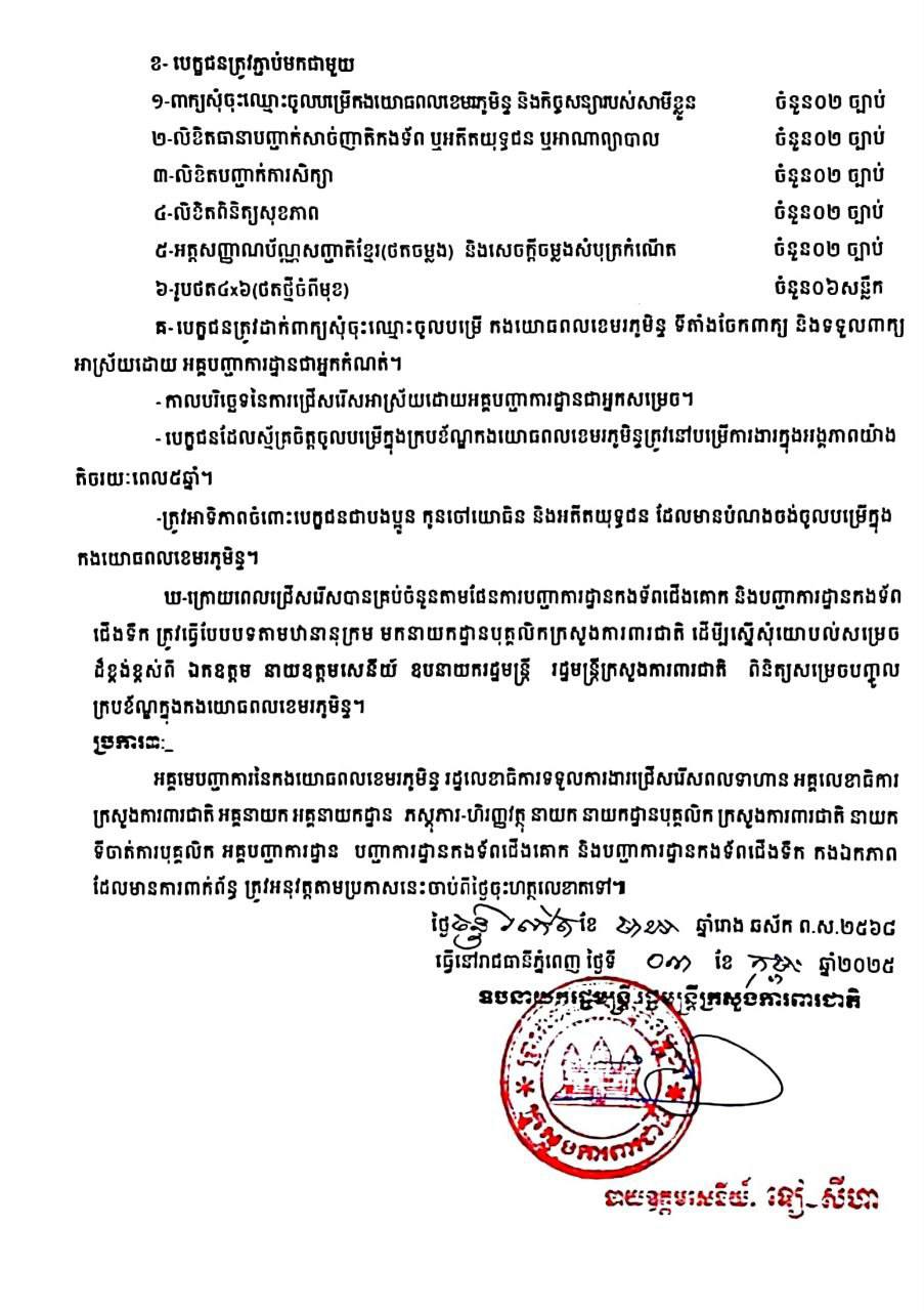 ដោយអគ្គបញ្ជាការដ្ឋាន បញ្ជាការដ្ឋានកងទ័ពជើងគោក និងបញ្ជាការដ្ឋានកងទ័ពជើងទឹក ធ្វើការ ជ្រើសរើសពលទាហាន ចំនួន ២.០០០ (ពីរពាន់)នាក់ទៅ តាមសេចក្តីសម្រេចរបស់រាជរដ្ឋាភិបាល លេខ០៣/ស.ស.រ ចុះថ្ងៃទី១៣ ខែមករា ឆ្នាំ២០២៥ ស្តីពីការជ្រើសរើសពលទាហាន ដើម្បីបំពេញក្របខ័ណ្ឌឲ្យកងឯកភាពដូចខាងក្រោម៖