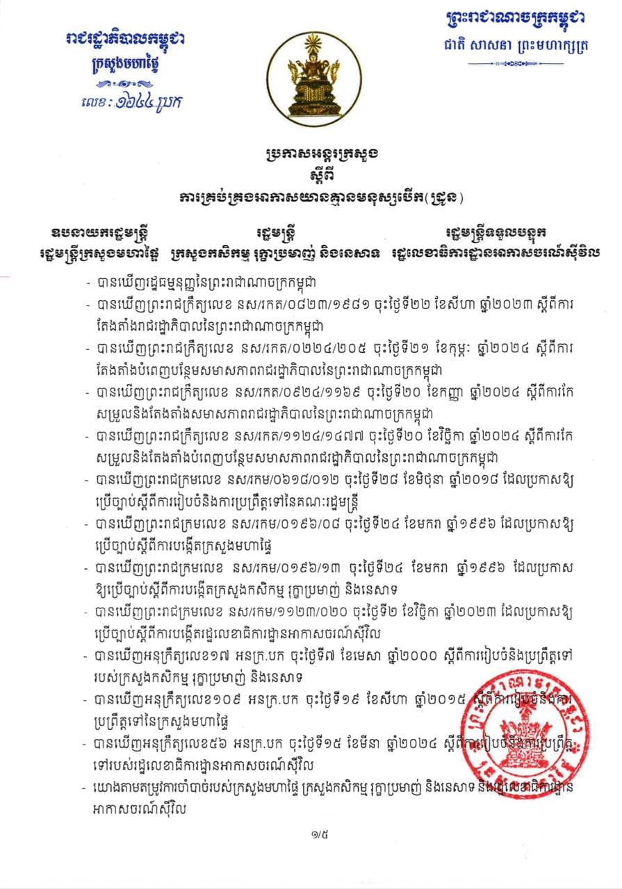 រាជធានីភ្នំពេញ៖ យោងតាមការចុះផ្សាយរបស់ ក្រសួងមហាផ្ទៃ នៅថ្ងៃទី១៥ ខែកុម្ភៈ ឆ្នាំ២០២៥ បានឱ្យដឹងថា ក្រសួង បានចេញប្រកាសអន្តរក្រសួង ស្តីពីការគ្រប់គ្រងអាកាសយាន គ្មានមនុស្សបើក (ដ្រូន)។