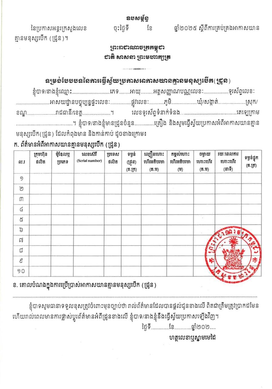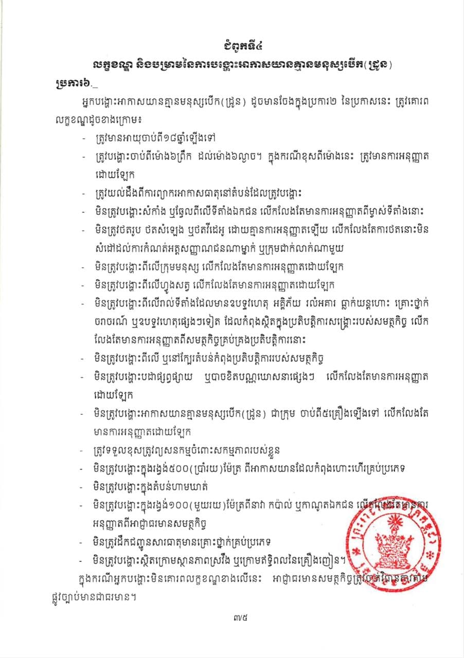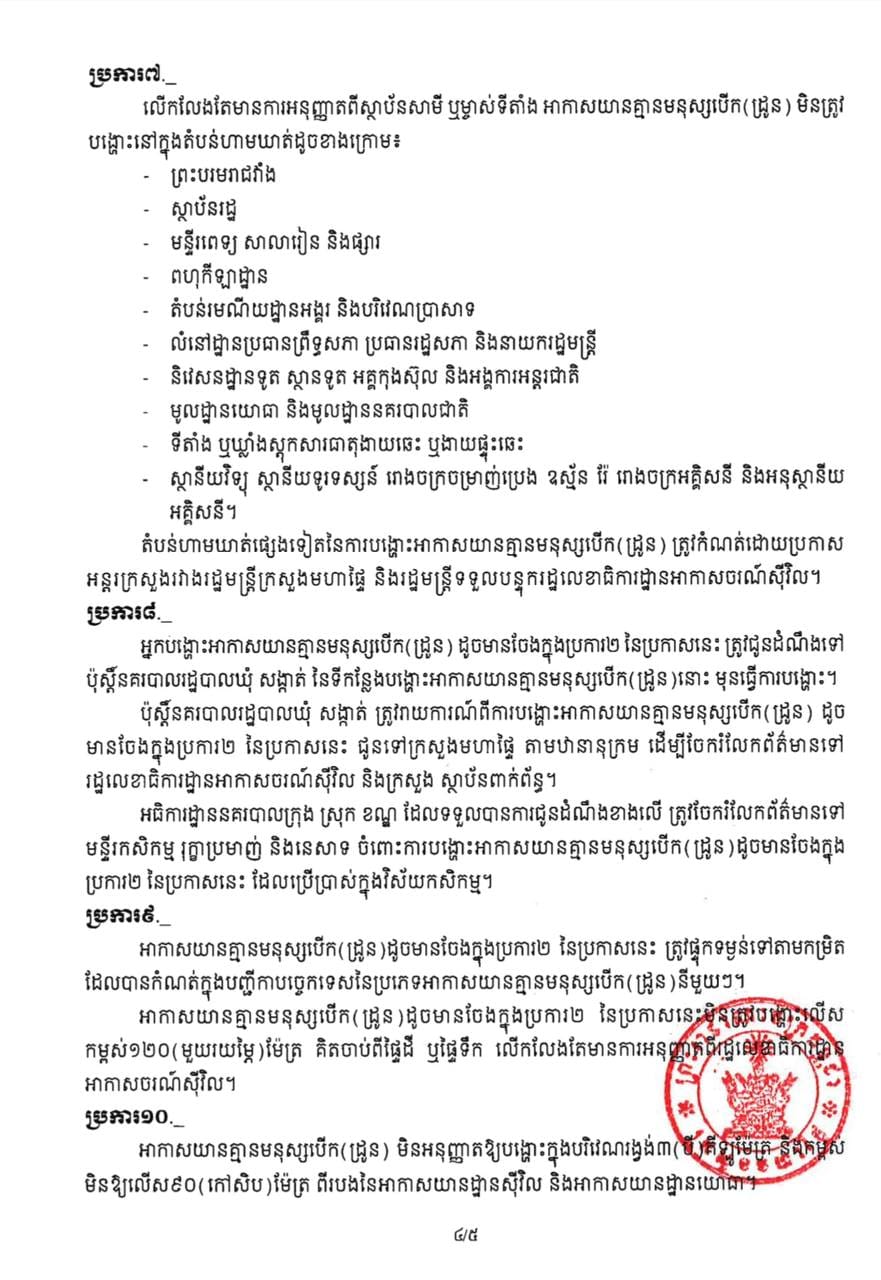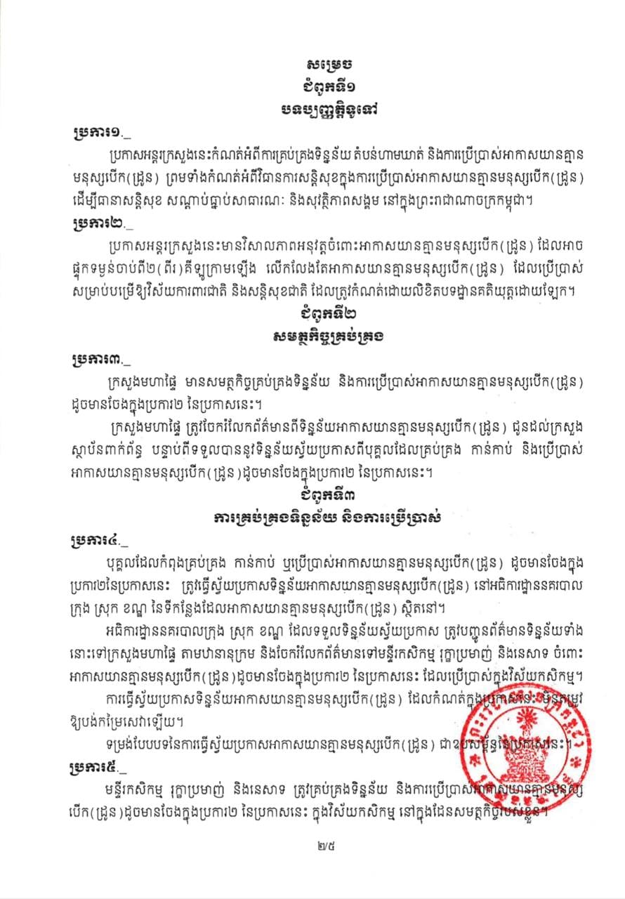 ករណីនេះ ក្រសួងមហាផ្ទៃ បានចេញប្រកាសអន្តរក្រសួង ស្តីពីការគ្រប់គ្រងអាកាសយាន គ្មានមនុស្សបើក(ដ្រូន) ដើម្បីកំណត់អំពីការគ្រប់គ្រងទិន្នន័យ តំបន់ហាមឃាត់ និងការប្រើប្រាស់អាកាសយានគ្មាន មនុស្សបើក(ដ្រូន) ព្រមទាំងកំណត់អំពីវិធានការសន្តិសុខក្នុងការប្រើប្រាស់អាកាសយានគ្មានមនុស្សបើក(ដ្រូន) ដើម្បីធានាសន្តិសុខ សណ្តាប់ធ្នាប់សាធារណៈ និងសុវត្ថិភាពសង្គម នៅក្នុងព្រះរាជាណាចក្រកម្ពុជា៕