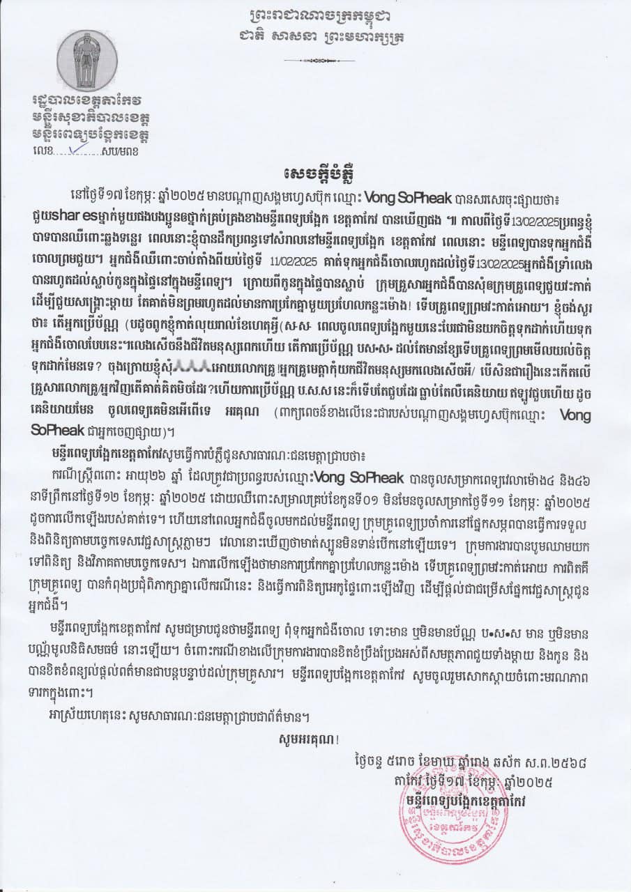 យោងតាមសេចក្ដីបំភ្លឺរបស់ មន្ទីរពេទ្យបង្អែកខេត្តតាកែវ បានឱ្យដឹងថា ករណីស្ត្រីពពោះ អាយុ២៦ ឆ្នាំ ដែលត្រូវជាប្រពន្ធរបស់ឈ្មោះ Vong SoPheak បានចូលសម្រាកពេទ្យវេលាម៉ោង៤ និង៤៦នាទីព្រឹក នៅថ្ងៃទី១២ ខែកុម្ភៈ ឆ្នាំ ២០២៥ ដោយឈឺពោះសម្រាលគ្រប់ខែកូនទី០១ មិនមែនចូលសម្រាកថ្ងៃទី១១ ខែកុម្ភៈ ឆ្នាំ២០២៥ ដូចការលើក ឡើងរបស់គាត់ទេ។ ហើយនៅពេលអ្នកជំងឺចូលមកដល់មន្ទីរពេទ្យ ក្រុមគ្រូពេទ្យប្រចាំការនៅផ្នែកសម្ភពបានធ្វើការទទួល និងពិនិត្យ តាមបច្ចេកទេសវេជ្ជសាស្ត្រភ្លាមៗ វេលានោះឃើញថាមាត់ស្បូនមិនទាន់បើកនៅឡើយទេ។ ក្រុមការងារបានបូមឈាមយកទៅពិនិត្យ និងវិភាគតាមបច្ចេកទេស។ ឯការលើកឡើងថាមានការប្រកែកគ្នាប្រហែលកន្លះម៉ោង ទើបគ្រូពេទ្យព្រមវះកាត់អោយ ការពិតគឺក្រុមគ្រូពេទ្យ បានកំពុងប្រជុំពិភាក្សាគ្នាលើករណីនេះ និងធ្វើការពិនិត្យអេកូផ្ទៃពោះឡើងវិញ ដើម្បីផ្តល់ជាជម្រើសផ្នែកវេជ្ជសាស្ត្រជូនអ្នកជំងឺ។