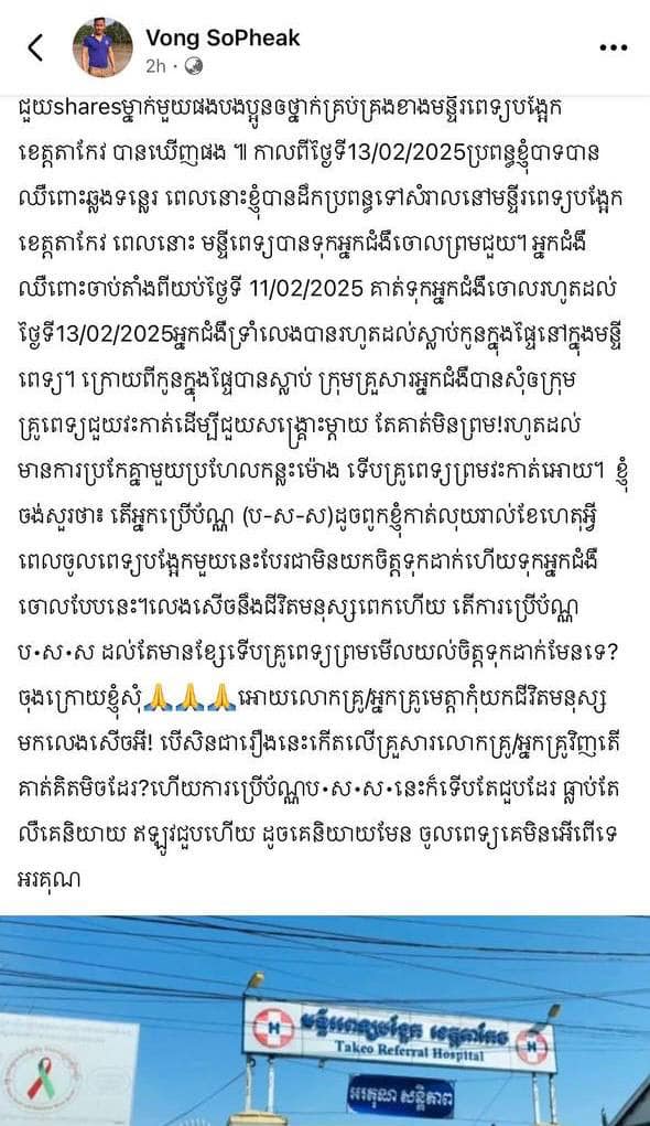 (តាកែវ)៖ កាលពីថ្ងៃទី ១៧ ខែកុម្ភៈ ឆ្នាំ ២០២៥ មន្ទីរពេទ្យបង្អែកខេត្តតាកែវ ចេញសេចក្តីបំភ្លឺពាក់ព័ន្ធនឹងគណនីហ្វេសប៊ុកមួយ ឈ្មោះ Vong SoPheaK ដែលបានបង្ហោះផ្សាយថា មន្ទីរពេទ្យបង្អែកខេត្តតាកែវបានទុកប្រពន្ធគាត់ចោលរហូតបណ្ដាលឱ្យស្លាប់កូនក្នុងផ្ទៃនៅមន្ទីរពេទ្យ៖
