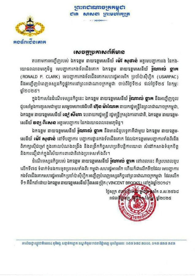 យោងតាមការចុះផ្សាយរបស់ ក្រសួងព័ត៌មាន បានឱ្យដឹងថា តបតាមការអញ្ជើញរបស់ ឯកឧត្តម នាយឧត្តមសេនីយ៍ ម៉ៅ សុផាន់ អគ្គមេបញ្ជាការរង នៃកងយោធពលខេមរភូមិន្ទ មេបញ្ជាការកងទ័ពជើងគោក ឯកឧត្តម នាយឧត្ដមសេនីយ៍ រ៉ូណាល់ ខ្លាក (RONALD P.CLARK) មេបញ្ជាការកងទ័ពជើងគោកសហរដ្ឋអាមេរិក ប្រចាំប៉ាស៊ីហ្វិក (USARPAC) នឹងអញ្ជើញបំពេញទស្សនកិច្ចផ្លូវការនៅព្រះរាជាណាចក្រកម្ពុជា ចាប់ពីថ្ងៃទី២៤ ដល់ថ្ងៃទី២៥ ខែកុម្ភៈ ឆ្នាំ២០២៥។ នេះបើយោងតាមសេចក្ដីប្រកាសព័ត៍មានរបស់ក្រសួងការពារជាតិ។