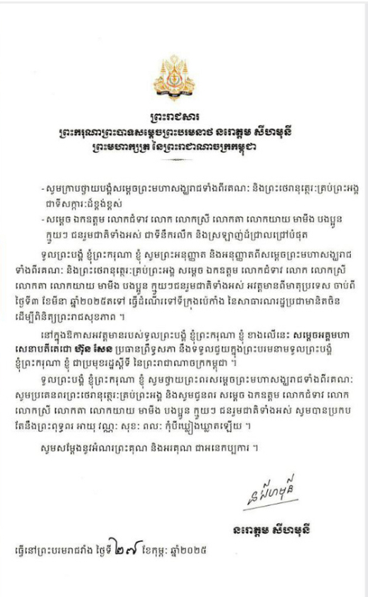 ស្អែកនេះ ព្រះករុណាព្រះបាទសម្ដេចព្រះបរមនាថ នរោត្ដម សីហមុនី ព្រះមហាក្សត្រ នៃព្រះរាជាណាចក្រកម្ពុជា ជាទីគោរពសក្ការៈដ៏ខ្ពង់ខ្ពស់បំផុត ព្រះអង្គសព្វព្រះរាជហឬទ័យ ស្តេចនឹងយាងទៅទីក្រុងប៉េកាំង នៃសាធារណរដ្ឋប្រជាមានិតចិន ដើម្បីពិនិត្យព្រះរាជសុខភាព