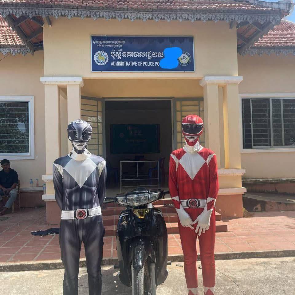យុវជន ២នាក់ បង្ហោះម៉ូតូ ស្លៀកពាក់ជាតួ Power Rangers ត្រូវសមត្ថកិច្ចស្រុករំដួល ខេត្តស្វាយរៀង ឃាត់ខ្លួន និងយកមកឣប់រំ