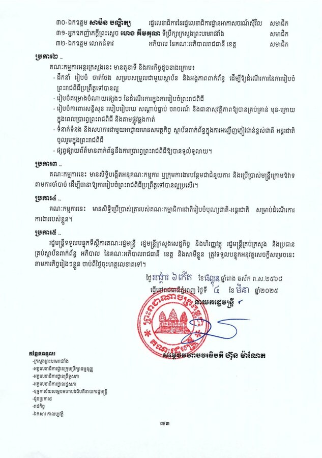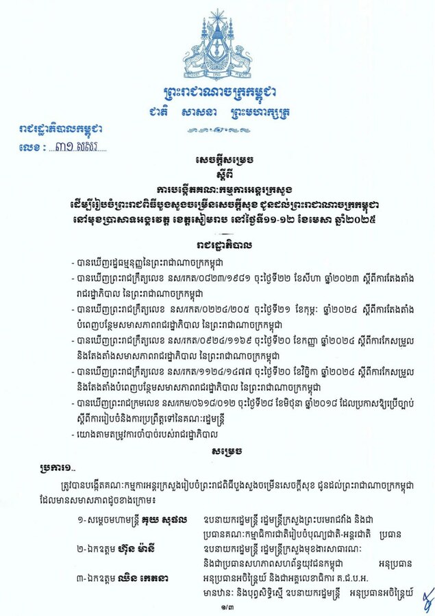 យោងតាមការចុះផ្សាយរបស់ ក្រសួងព័ត៌មាន បានឱ្យដឹងថា រាជរដ្ឋាភិបាល ចេញសេចក្តីសម្រេចបង្កើតគណៈកម្មការអន្តរក្រសួង ដើម្បីរៀបចំព្រះរាជពិធីបួងសួងចម្រើនសេចក្តីសុខ ជូនដល់ព្រះរាជាណាចក្រកម្ពុជា នៅមុខប្រាសាទអង្គរវត្ត នាថ្ងៃទី១១ ១២ ខែមេសា ឆ្នាំ២០២៥ ខាងមុខនេះ។