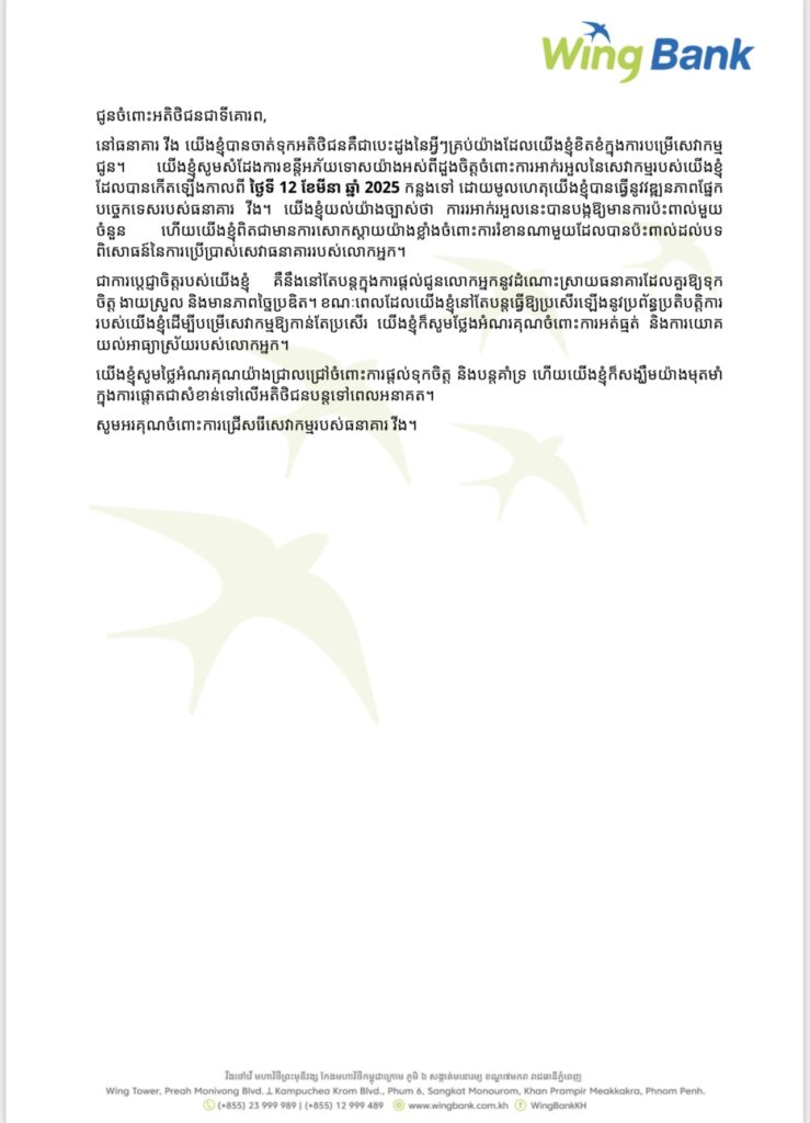 នៅធនាគារ វីង យើងខ្ញុំបានចាត់ទុកអតិថិជនគឺជាបេះដូងនៃអ្វីៗគ្រប់យ៉ាងដែលយើងខ្ញុំខិតខំក្នុងការបម្រើសេវាកម្មជូន។ យើងខ្ញុំសូមសម្តែងការខន្តីអភ័យទោសយ៉ាងអស់ពីដួងចិត្តចំពោះការអាក់រអួលនៃសេវាកម្មរបស់យើងខ្ញុំ ដែលបានកើតឡើងកាលពី ថ្ងៃទី 12 ខែមីនា ឆ្នាំ 2025 កន្លងទៅ ដោយមូលហេតុយើងខ្ញុំបានធ្វើនូវវឌ្ឍនភាពផ្នែកបច្ចេកទេសរបស់ធនាគារ វីង។ យើងខ្ញុំយល់យ៉ាងច្បាស់ថា ការរអាក់រអួលនេះបានបង្កឱ្យមានការប៉ះពាល់មួយចំនួន ហើយយើងខ្ញុំពិតជាមានការសោកស្តាយយ៉ាងខ្លាំងចំពោះការរំខានណាមួយដែលបានប៉ះពាល់ដល់បទពិសោធន៍នៃការប្រើប្រាស់សេវាធនាគាររបស់លោកអ្នក។
