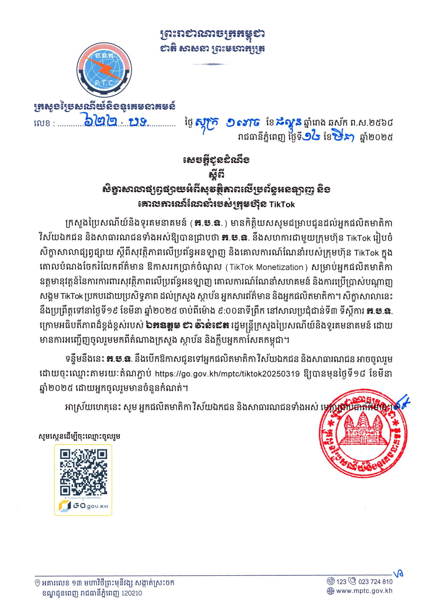 តាមការបញ្ចាក់ខាងលើគោលការណ៍ណែនាំរបស់ក្រុមហ៊ុន TikTok នេះ ក្នុងគោលបំណងចែករំលែកព័ត៌មាន ឱកាសរកប្រាក់ចំណូល (TikTok Monetization) សម្រាប់អ្នកផលិតមាតិកា ឧត្តមានុវត្តន៍នៃការការពារសុវត្ថិភាពលើប្រព័ន្ធអនឡាញ គោលការណ៍ណែនាំសហគមន៍ និងការប្រើប្រាស់បណ្តាញសង្គម TikTok ប្រកបដោយប្រសិទ្ធភាព ដល់ក្រសួង ស្ថាប័ន អ្នកសារព័ត៌មាន និងអ្នកផលិតមាតិកា។ សិក្ខាសាលានេះ នឹងប្រព្រឹត្តទៅនាថ្ងៃទី១៩ ខែមីើនា ឆ្នាំ២០២៥ ចាប់ពីម៉ោង ៩:០០នាទីព្រឹក នៅសាលប្រជុំជាន់ទី៣ ទីស្ដីការ ក.ប.ទ. ក្រោមអធិបតីភាពដ៏ខ្ពង់ខ្ពស់របស់ ឯកឧត្តម ជា វ៉ាន់ដេត រដ្ឋមន្ត្រីក្រសួងប្រៃសណីយ៍និងទូរគមនាគមន៍ ដោយមានការអញ្ជើញចូលរួមមកពីតំណាងក្រសួង ស្ថាប័ន និងក្លឹបអ្នកកាសែតកម្ពុជា។