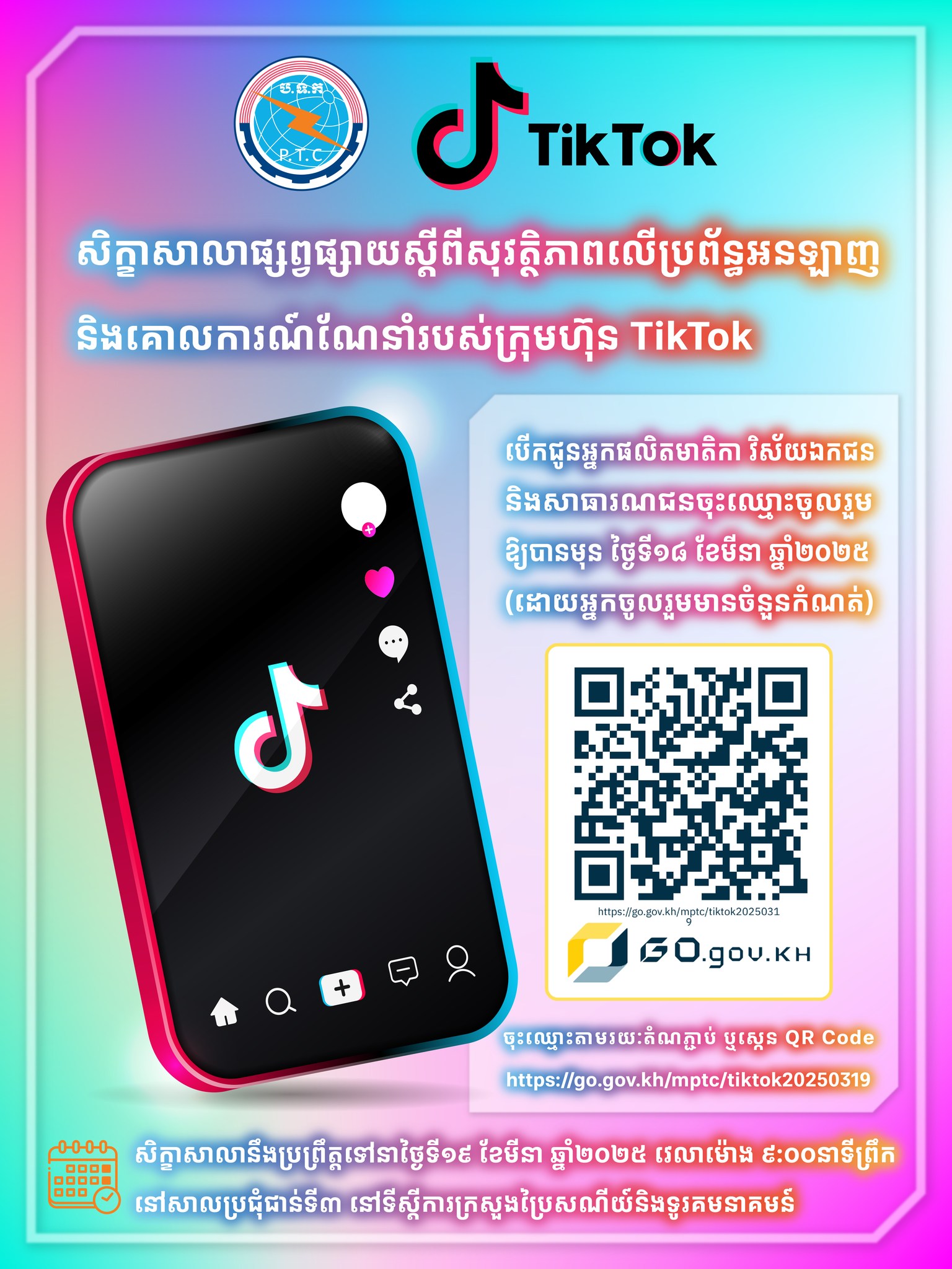 រាជធានីភ្នំពេញ៖ យោងតាមការចុះផ្សាយរបស់ ក្រសួងប្រៃសណីយ៍ និងទូរគមនាគម បានឱ្យដឹងថា ក្រសួង មានកិត្តិយសសូមជម្រាបជូនដល់អ្នកផលិតមាតិកា វិស័យឯកជន និងសាធារណជនទាំងអស់ឱ្យបានជ្រាបថា ក្រសួងប្រៃសណីយ៍និងទូរគមនាគមន៍ (ក.ប.ទ.) នឹងសហការជាមួយក្រុមហ៊ុន TikTok រៀបចំសិក្ខាសាលាផ្សព្វផ្សាយ ស្ដីពី សិក្ខាសាលាផ្សព្វផ្សាយអំពីសុវត្ថិភាពលើប្រព័ន្ធអនឡាញ និងគោលការណ៍ណែនាំរបស់ក្រុមហ៊ុន TikTok។