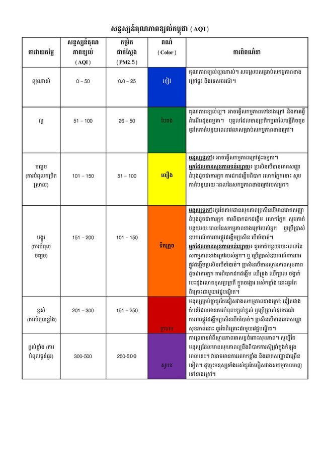 ពណ៌ខៀវៈ គុណភាពខ្យល់ល្អណាស់មាន ខេត្តកំពង់ឆ្នាំង ខេត្តព្រៃវែង ខេត្តកែប ខេត្តក្រចេះ ខេត្តមណ្ឌលគីរី ខេត្តត្បូងឃ្មុំ ខេត្តកំពត ខេត្តកំពង់ចាម ខេត្តស្វាយរៀង ខេត្តកោះកុង ខេត្តព្រះសីហនុ ខេត្តបាត់ដំបង ខេត្តកំពង់ស្ពឺ ខេត្តប៉ៃលិន ខេត្តតាកែវ រាជធានីភ្នំពេញ និងខេត្តឧត្តរមានជ័យ