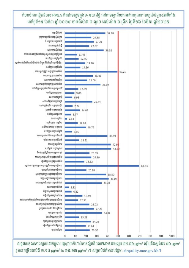 ក្រសួងបរិស្ថាន ជូនដំណឹងអំពីស្ថានភាពគុណភាពខ្យល់នៅក្នុងព្រះរាជាណាចក្រកម្ពុជា សម្រាប់ថ្ងៃទី១៥ ខែមីនា ឆ្នាំ២០២៥ ចាប់ពីម៉ោង ៦ ល្ងាច ដល់ម៉ោង ៦ ព្រឹក ថ្ងៃទី១៦ ខែមីនា ឆ្នាំ២០២៥ ដែលមានកំហាប់ភាគល្អិតនិចលគិតជាមធ្យមស្មើនឹង២២.៨៦ µg/m3 ធៀបនឹងស្តង់ដារ ៥០ ug/m3 និងគិតជាសន្ទស្សន៍គុណភាពខ្យល់ (Air Quality Index) គឺ“ល្អណាស់”។