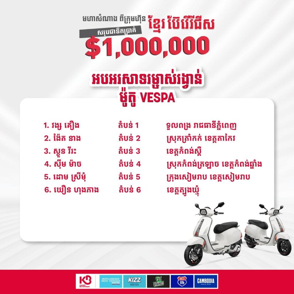 ១ ថ្ងៃសោះ! ខ្មែរ ប៊ែវើរីជីស ចែករង្វាន់ម៉ូតូ Vespa ៦ រង្វាន់ និងទូរស័ព្ទដៃ Samsung ១,៥០០ រង្វាន់ ដល់អតិថិជន