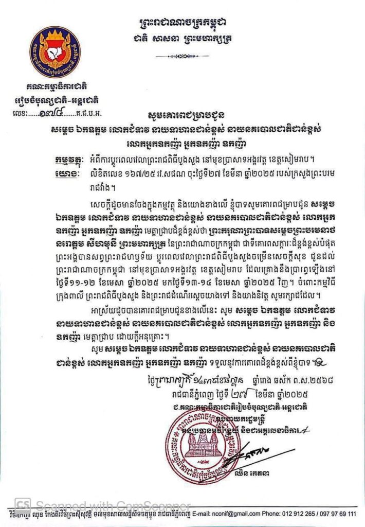 សូមបញ្ជាក់ថា ព្រះរាជពិធីបួងសួងចម្រើនសេចក្តីសុខនៅប្រាសាទអង្គរវត្ត នឹងប្រារព្ធឡើងក្រោមព្រះរាជាធិបតីភាពដ៏ខ្ពង់ខ្ពស់បំផុត របស់ព្រះករុណា ព្រះបាទ សម្តេចព្រះបរមនាថ នរោត្តម សីហមុនី ព្រះមហាក្សត្រខ្មែរ។