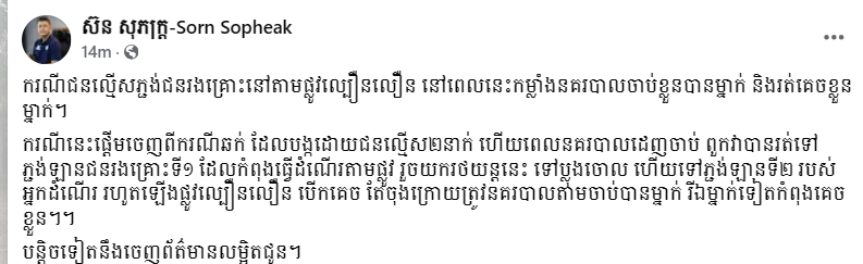ករណីជនល្មើសប្លន់រថយន្តលើផ្លូវល្បឿនលឿន នៅពេលនេះកម្លាំងនគរបាលចាប់ខ្លួនបានម្នាក់ និងរត់គេចខ្លួនម្នាក់