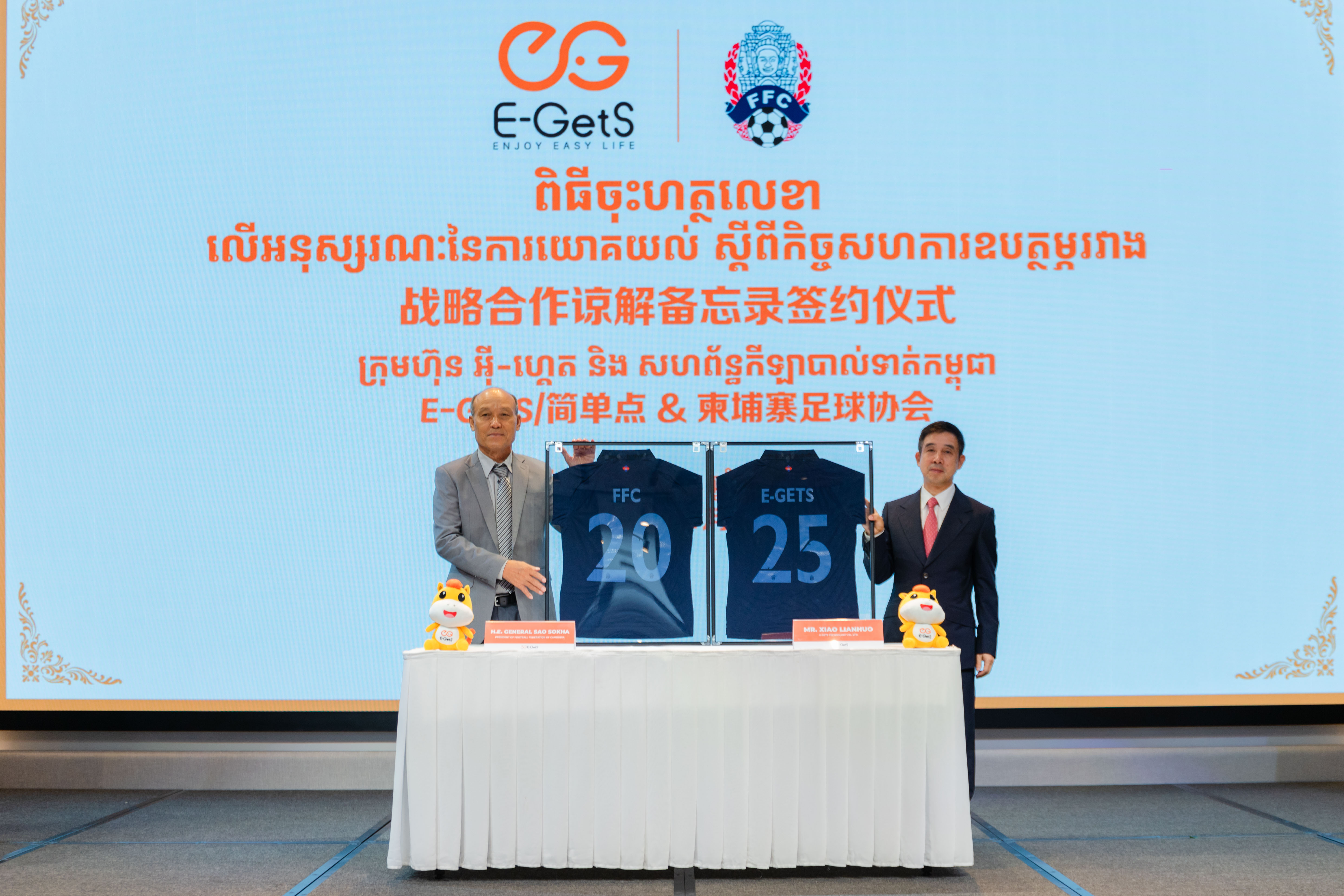 ថ្នាក់ដឹកនាំរបស់ក្រុមហ៊ុន E-GetS/អ៉ី-ហ្គេត និងសហព័ន្ធកីឡាបាល់ទាត់កម្ពុជា បានអញ្ជើញឡើងមកលើឆាកដើម្បីចុះហត្ថលេខាលើអនុស្សរណៈនៃការយោគយល់គ្នាស្តីពីកិច្ចសហការឧបត្ថម្ភ ដែលជាការកត់សម្គាល់ការបង្កើតកិច្ចសហប្រតិបត្តិការជាផ្លូវការរវាងភាគីទាំងពីរ។ បន្ទាប់មក ពិធីចុះហត្ថលេខា និងប្រគល់អាវកីឡាបាល់ទាត់ក៏បានប្រារព្ធឡើងព្រមគ្នាផងដែរ ហើយនេះជានិមិត្តសញ្ញាក្នុងការសហការ រួមដៃគ្នាក្នុងការជំរុញវិស័យកីឡាបាល់ទាត់កម្ពុជាឆ្ពោះទៅកាន់កម្រិតថ្មីមួយថែមទៀត។