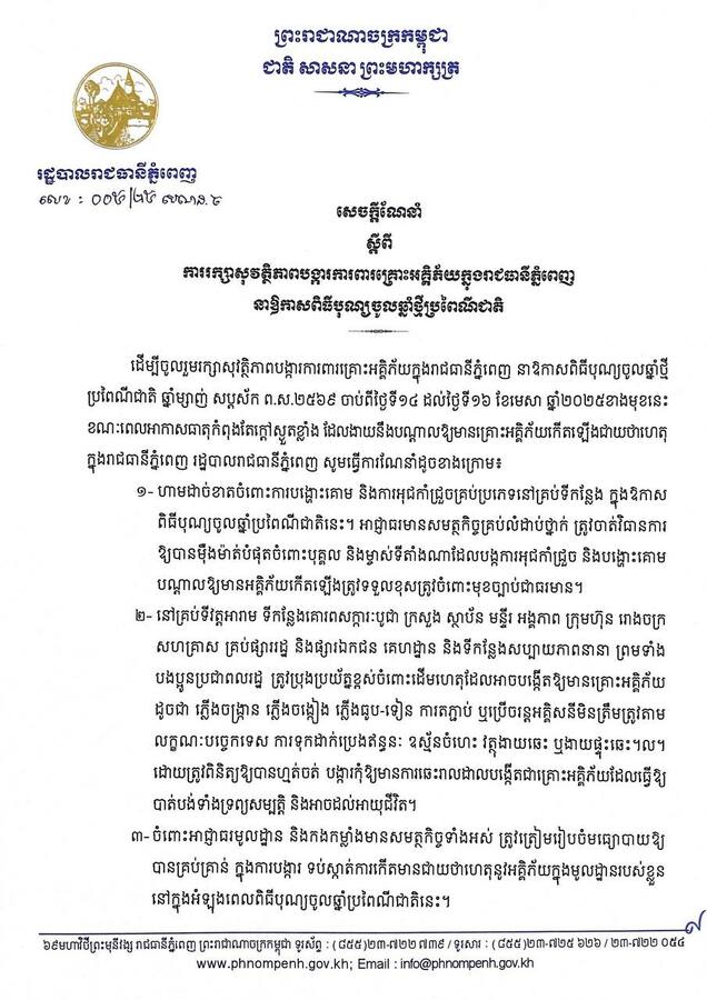 រាជធានីភ្នំពេញ៖ បើយោងតាមការចុះផ្សាយរបស់ក្រសួងព័ត៌មាន តាមសេចក្តីជូនដំណឹងរបស់រដ្ឋបាលរាជធានីភ្នំពេញបានឱ្យដឹងថា ដើម្បីចូលរួមរក្សាសុវត្ថិភាពបង្ការការពារគ្រោះអគ្គិភ័យក្នុងរាជធានីភ្នំពេញ នាឱកាសពិធីបុណ្យចូលឆ្នាំថ្មី ប្រពៃណីជាតិ ឆ្នាំម្សាញ់ សប្តស័ក ព.ស.២៥៦៩ ចាប់ពីថ្ងៃទី១៤ ដល់ថ្ងៃទី១៦ ខែមេសា ឆ្នាំ២០២៥ខាងមុខនេះ ខណៈពេលអាកាសធាតុកំពុងតែក្តៅស្ងួតខ្លាំង ដែលងាយនឹងបណ្តាលឱ្យមានគ្រោះអគ្គិភ័យកើតឡើងជាយថាហេតុ ក្នុងរាជធានីភ្នំពេញ រដ្ឋបាលរាជធានីភ្នំពេញ សូមធ្វើការណែនាំដូចខាងក្រោម៖