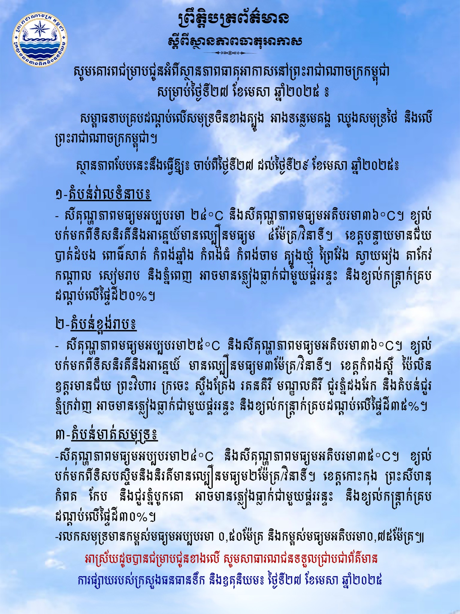 ស្ថានភាពធាតុអាកាសនៅកម្ពុជា ចាប់ពីថ្ងៃទី២៧ ដល់ថ្ងៃទី២៩ ខែមេសា អាចមានភ្លៀងធ្លាក់ជាមួយផ្គររន្ទះ លាយលំខ្យល់កន្ដ្រាក់