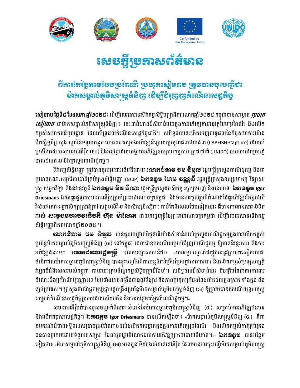 ក្នុងសេចក្ដីប្រកាសព័ត៌មានរបស់ ក្រសួងពាណិជ្មកម្ម បានបញ្ជាក់ថា ដើម្បីអបអរសាទរទិវាកម្មសិទ្ធិបញ្ញាពិភពលោកឆ្នាំ២០២៥ កម្ពុជាបានសម្ពោធ ប្រហុកសៀមរាប ជាម៉ាកសម្គាល់ភូមិសាស្ត្រទំនិញ។ នេះជាជំហានដ៏សំខាន់មួយក្នុងការអភិរក្សការអនុវត្តបែបប្រពៃណី និងលើក កម្ពស់សហគមន៍មូលដ្ឋាន ដែលគាំទ្រដល់កំណើនសេដ្ឋកិច្ចជាតិ។ សមិទ្ធផលនេះកើតចេញលទ្ធផលនៃកិច្ចសហការយ៉ាង ជិតស្និទ្ធពីក្រសួង ស្ថាប័នទទួលបន្ទុក តាមរយៈគម្រោងអភិវឌ្ឍន៍ក្រោយប្រមូលផលជលផល (CAPFISH-Capture) ដែលគាំ ទ្រថវិកាដោយសហភាពអឺរ៉ុប (EU) និងអនុវត្តដោយអង្គការអភិវឌ្ឍឧស្សាហកម្មសហប្រជាជាតិ (UNIDO) សហការជាមួយរដ្ឋ បាលជលផល និងក្រសួងពាណិជ្ជកម្ម។