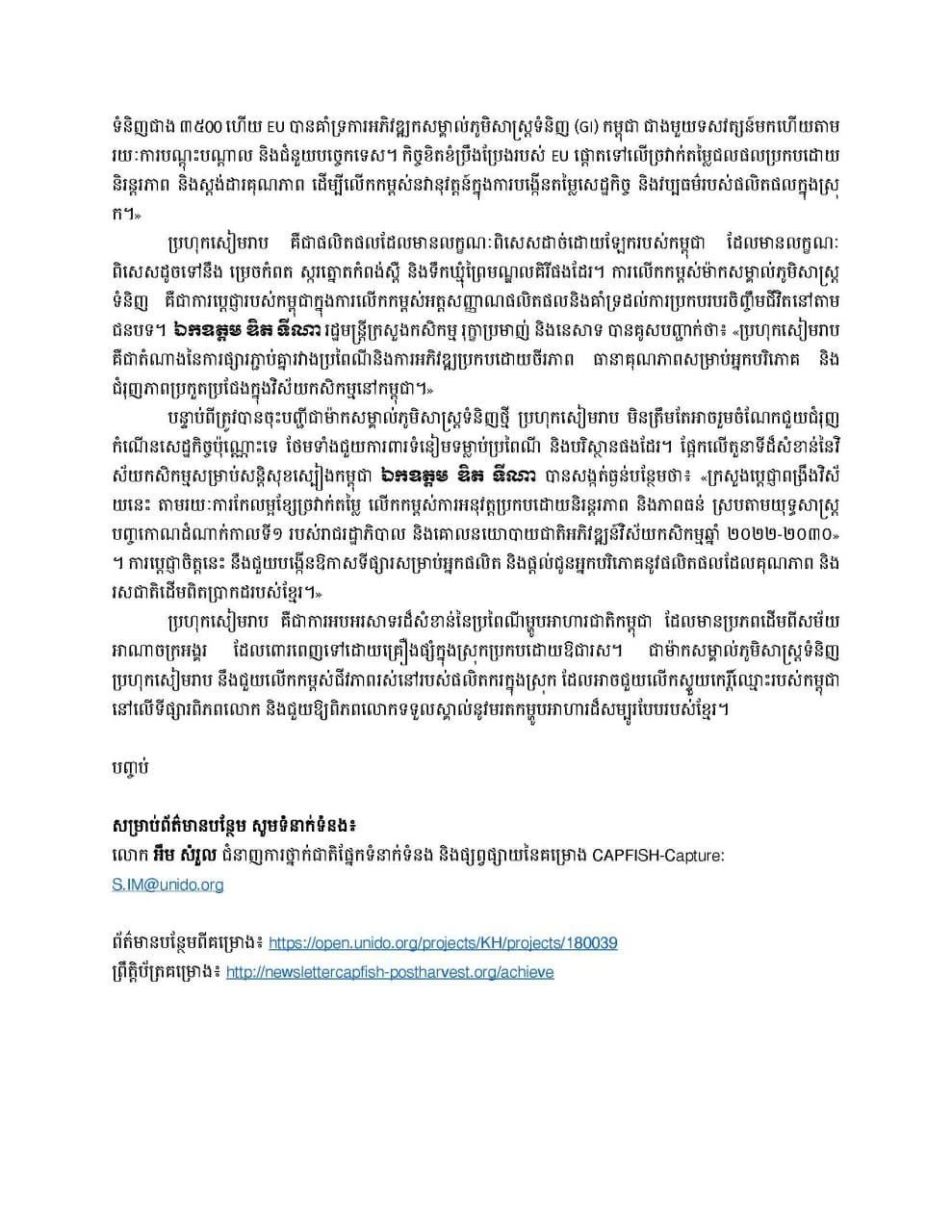 សហភាពអឺរ៉ុបក៏បានគូសបញ្ជាក់ពីសារៈសំខាន់នៃម៉ាកសម្គាល់ភូមិសាស្ត្រទំនិញ (GI) សម្រាប់ការអភិវឌ្ឍជនបទ និងលើកកម្ពស់សេដ្ឋកិច្ច។ ឯកឧត្តម Igor Driesmans បានលើកឡើងថា៖ «ម៉ាកសម្គាល់ភូមិសាស្ត្រទំនិញ (GI) គឺជា ឧបករណ៍ដ៏មានឥទ្ធិពលសម្រាប់ផ្តល់អំណាចដល់ផលិតកករខ្នាតតូចក្នុងការអភិរក្សប្រពៃណី និងលើកកម្ពស់ការគ្រប់គ្រង ធនធានប្រកបដោយទំនួលខុសត្រូវ ដែលចូលរួមចំណែកដល់ការអភិវឌ្ឍប្រកបដោយចីរភាព។» ឯកឧត្តម បានបន្ថែម ទៀតថា៖ «ម៉ាកសម្គាល់ភូមិសាស្ត្រទំនិញ (GI) មានតួនាទីយ៉ាងសំខាន់នៅអឺរ៉ុប ដែលមានការចុះបញ្ជីម៉ាកសម្គាល់ភូមិសាស្ត្រទំនិញជាង ៣៥០០ ហើយ EU បានគាំទ្រការអភិវឌ្ឍកសម្គាល់ភូមិសាស្ត្រទំនិញ (GI) កម្ពុជា ជាងមួយទសវត្សន៍មកហើយតាម រយៈការបណ្តុះបណ្តាល និងជំនួយបច្ចេកទេស។ កិច្ចខិតខំប្រឹងប្រែងរបស់ EU ផ្តោតទៅលើច្រវាក់តម្លៃជលផលប្រកបដោយ និរន្តរភាព និងស្តង់ដារគុណភាព ដើម្បីលើកកម្ពស់នវានុវត្តន៍ក្នុងការបង្កើនតម្លៃសេដ្ឋកិច្ច និងវប្បធម៌របស់ផលិតផលក្នុងស្រុ ក។»