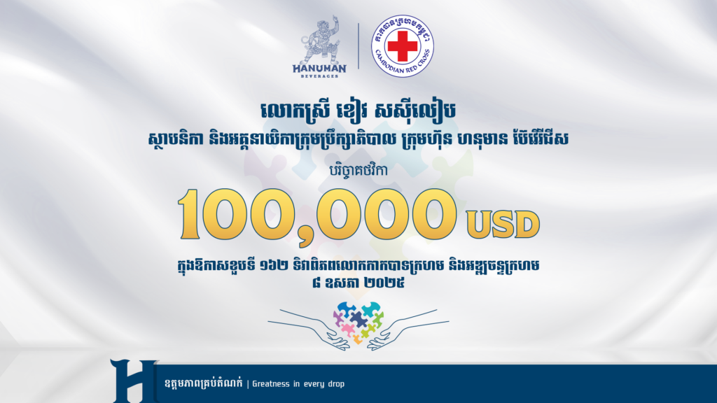 លោកជំទាវ ខៀវ សស៊ីលៀប ស្ថាបនិកា និងជាអគ្គនាយិកា នៃក្រុមហ៊ុន ហនុមាន ប៊ែវើរីជីស (Hanuman Beverages) បានបរិច្ចាគថវិកាចំនួន ១០ម៉ឺនដុល្លារអាមេរិក ជូនកាកបាទក្រហមកម្ពុជា ក្នុងឱកាសខួបទី១៦២ ទិវាពិភពលោកកាកបាទក្រហម និងអឌ្ឍចន្ទក្រហម ៨ ឧសភា ឆ្នាំ២០២៥ និងខួបលើកទី៧០ឆ្នាំ នៃកាកបាទក្រហមកម្ពុជា ក្រោមមូលបទ «រួមគ្នាស្ម័គ្រចិត្ត ដើម្បីសហគមន៍មានសុខភាពល្អ និងមានភាពធន់នឹងអាកាសធាតុ»។