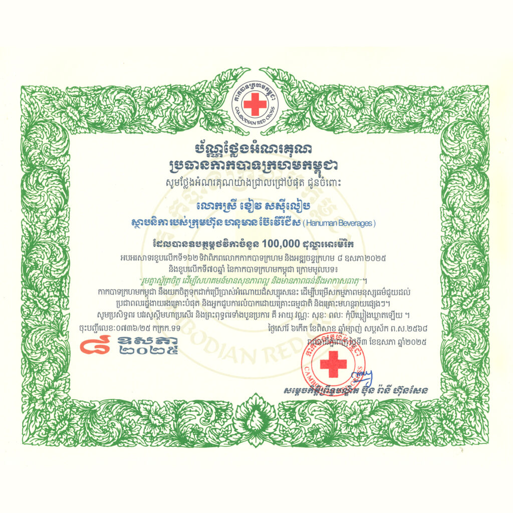 ក្រុមហ៊ុន ហនុមាន ប៊ែវើរីជីស សូមអំពាវនាវដល់សប្បុរសជនគ្រប់មជ្ឈដ្ឋាន សូមមេត្តាចូលរួមបរិច្ចាគថវិកា ជូនកាកបាទក្រហមក្រហមកម្ពុជា ក្នុងឱកាសខួបលើកទី១៦២ ទិវាពិភពលោកកាកបាទក្រហម និងអឌ្ឍចន្ទក្រហម ៨ ឧសភា ២០២៥ ឱ្យបានផុលផុសដើម្បីឱ្យសមាគមជាតិមួយនេះ មានមូលនិធិគ្រប់គ្រាន់សម្រាប់បន្តបេសកកម្មមនុស្សធម៌ ជួយប្រជាពលរដ្ឋងាយរងគ្រោះបំផុតគ្រប់រូបភាព រួមទាំងគ្រោះមហន្តរាយបង្កឡើងដោយមនុស្ស និងធម្មជាតិ ដែលកើតមានឡើងនៅក្នុងព្រះរាជាណាចក្រកម្ពុជាយើងក៏ដូចជានៅទីកន្លែងផ្សេងទៀត ក្នុងតំបន់ និងក្នុងពិភពលោក។