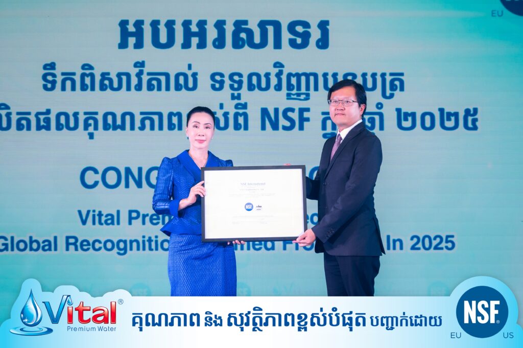 គួរបញ្ជាក់ផងដែរថា ស្ថាប័នអន្តរជាតិ NSF គឺជាស្ថាប័នឯករាជ្យនិងទទួលស្គាល់ជាសកលផ្តោតសំខាន់លើស្តង់ដាសុខភាពសាធារណៈនិងការទទួលស្គាល់គុណភាពខ្ពស់ដើម្បីជួយពង្រឹងគុណភាពម្ហូបអាហារ ទឹកពិសា ផលិតផលទទួលទានផ្សេងៗ និងបរិស្ថាននានា។ លោក ភីរ៉ាក់ភុង ផៃស៊ីតគុនវិវ៉ាត់ ប្រធានអនុវត្តកិច្ចការសវនកម្មប្រចាំតំបន់អាស៊ីប៉ាស៊ីហ្វិកនៃស្ថាប័ន NSF បានថ្លែងក្នុងសន្និសីទសារព័ត៌មានថា៖ “ការទទួលបានវិញ្ញាបនបត្រ NSF មិនមែនជាសមិទ្ធផលផ្នែកបច្ចេកទេស សំដៅលើគុណភាពផលិតផលតែប៉ុណ្ណោះទេ តែជាការទទួលស្គាល់ជាសកលចំពោះការប្តេជ្ញាចិត្តដ៏ក្លៀវក្លារបស់វីតាល់ ចំពោះសុវត្ថិភាព និងគុណភាព”។
