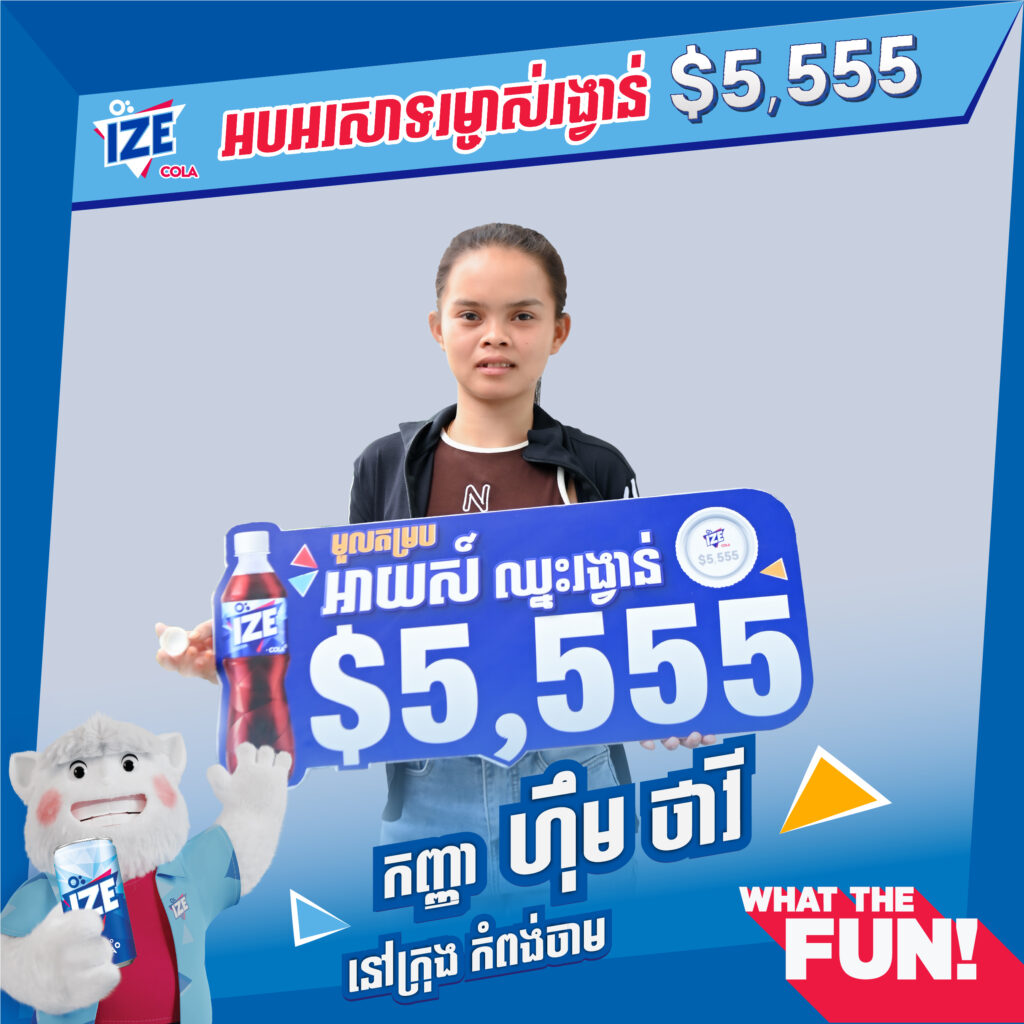 គួរបញ្ជាក់ថា ទឹកក្រូចអាយស៍កូឡា ជាផលិតផល «Made in Cambodia» គុណភាពស្តង់ដារអន្តរជាតិ របស់ក្រុមហ៊ុន ខ្មែរ ប៊ែវើរីជីស។ ហើយបងប្អូន នឹងមានឱកាសឈ្នះរង្វាន់ជាច្រើនរួមមាន៖ រថយន្ត Toyota Raize ស៊េរីថ្មី, រង្វាន់លុយ $5555, ម៉ូតូ Honda Scoopy Club 12 ស៊េរីថ្មី, ទូរស័ព្ទ Samsung Galaxy A55 ស៊េរីថ្មីស៊ីវីល័យ និងលុយសុទ្ធជាច្រើនរង្វាន់។