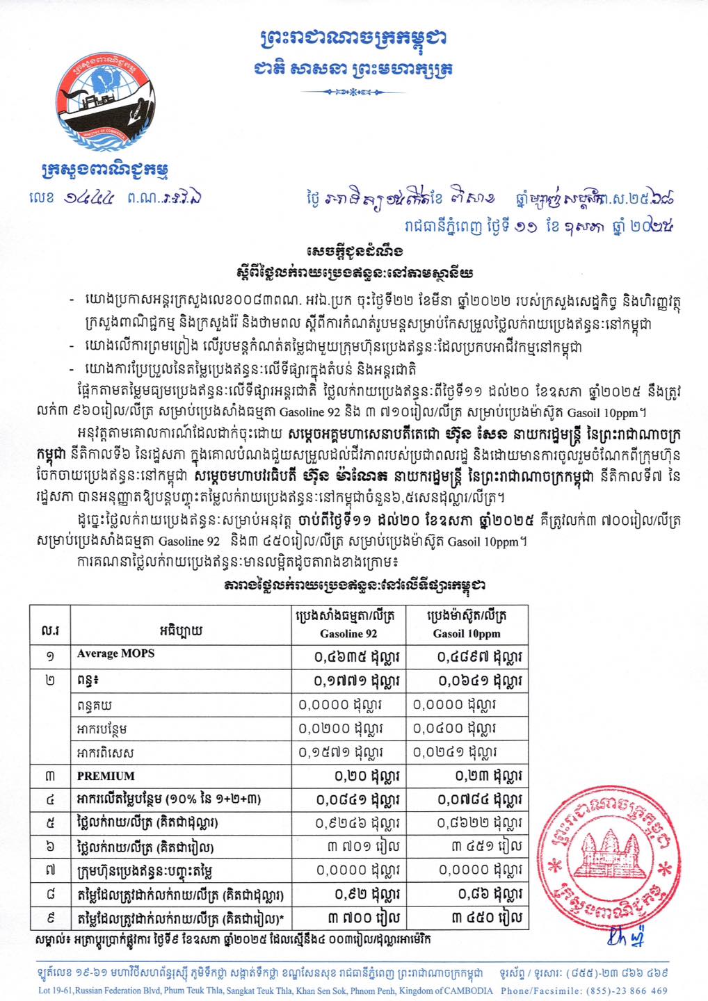 (រាជធានីភ្នំពេញ)៖ យោងតាមការចុះផ្សាយរបស់ ក្រសួងពាណិជ្ជកម្ម នៅថ្ងៃទី១១ ខែឧសភា ឆ្នាំ ២០២៥ នេះ បានឱ្យដឹងថា តម្លៃលក់រាយប្រេងឥន្ធនៈនៅតាមស្ថានីយ ដែលត្រូវអនុវត្តចាប់ពីថ្ងៃទី១១ ដល់ថ្ងៃទី២០ ខែឧសភា ឆ្នាំ២០២៥ នេះ៖