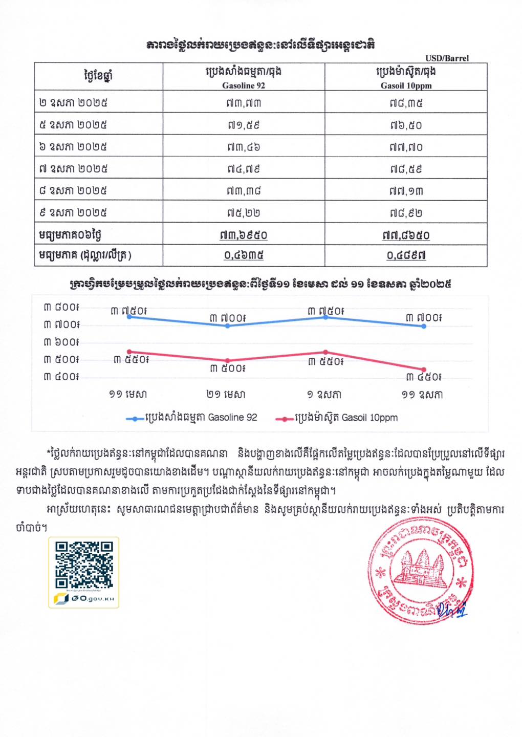 – ប្រេងសាំងធម្មតា = ៣ ៧០០ រៀល/លីត្រ (ចុះថ្លៃ ៥០៛)