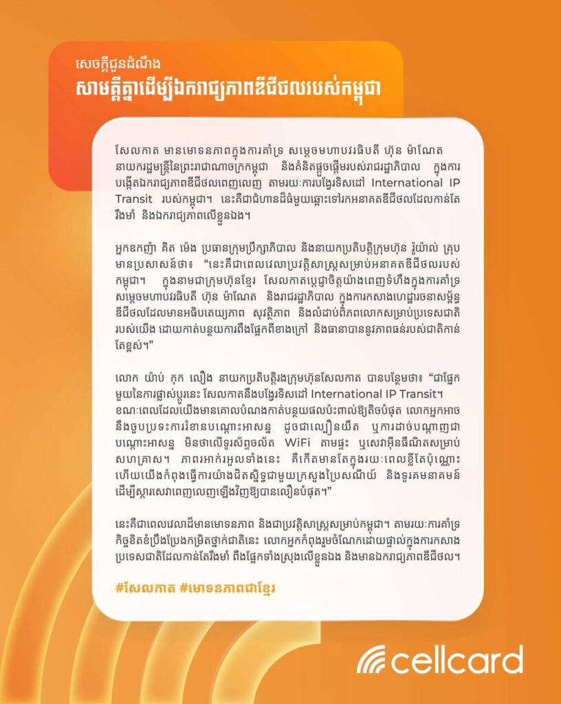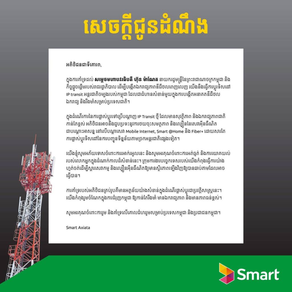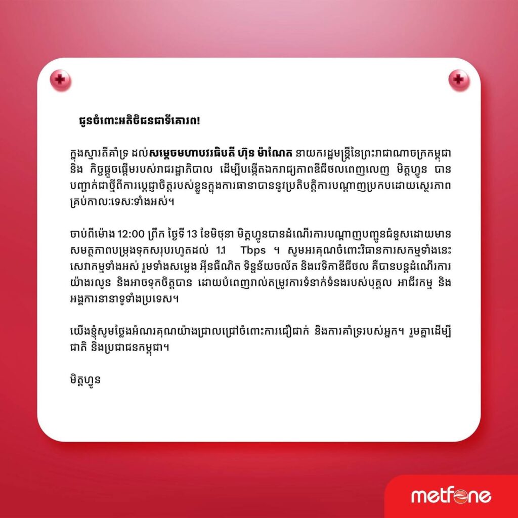 ក្រុមហ៊ុន Smart, Cellcard និង Metfone ក៏បានបង្ហាញពីការប្តេជ្ញាចិត្តរបស់ពួកគេនៅផេកហ្វេកប៊ុកផ្លូវការរបស់ពួកគេផងដែរ ក្នុងការស្តារភ្ជាប់ដំណើរការ និងមានស្ថេរភាពឡើងវិញឱ្យបានលឿន តាមដែលអាចធ្វើទៅបានក្នុងពេលឆាប់ៗ។ នៅក្នុងសេចក្តីប្រកាសផ្លូវការនោះ ក្រុមហ៊ុន Smart និង Cellcard បានប្រកាសថា ពួកគេបានប្តូរទៅប្រើបណ្ដាញ IP Transit ថ្មី ទៅទិសដៅផ្សេង វិញ ខណៈដែល Metfone បានដំណើរការបណ្តាញសេវាជំនួសរួចរាល់ ដែលមានសមត្ថភាពបម្រុងទុកសរុប រហូតដល់ 1.1 Tbps ។ ដូច្នេះហើយ ក្នុងអំឡុងពេលនេះ សម្រាប់អ្នកប្រើប្រាស់ Metfone នៅតែអាចទទួលបានបណ្តាញសេវាប្រើប្រាស់ ដោយមិនមានការរំខានណាមួយឡើយ។