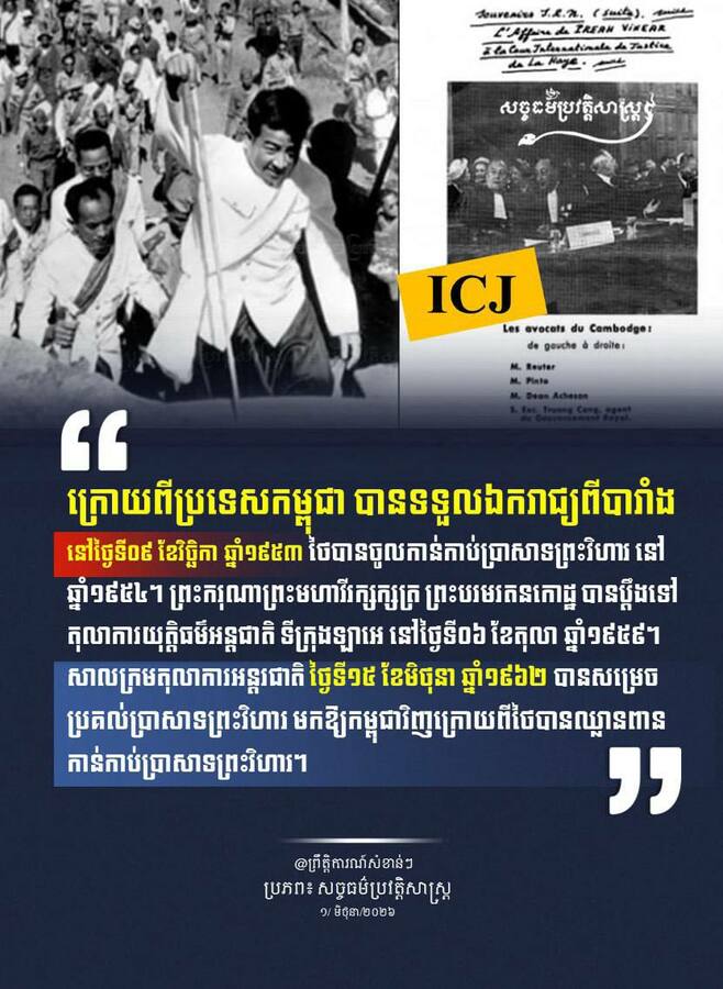 ថ្ងៃស្អែក គឺជាខួបលើកទី៦៣ ដែលតុលាការយុត្តិធម៌អន្តរជាតិក្រុងឡាអេ សម្រេចឱ្យកម្ពុជាជាម្ចាស់កម្មសិទ្ធិលើប្រាសាទព្រះវិហារ (១៥ មិថុនា១៩៦២ – ១៥ មិថុនា ២០២៥)